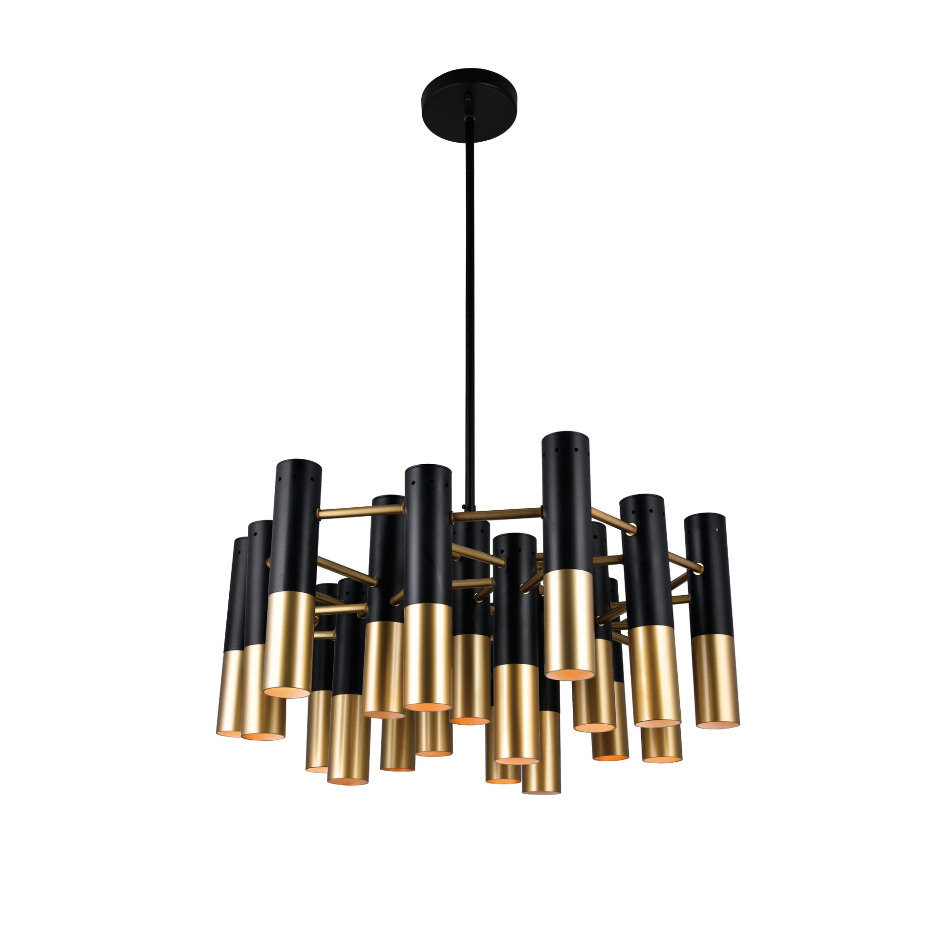 Add a premium look to your space with this Large Anem 19 Light Chandelier. Designed as a transitional downlight with candelabra base, this piece gets a modern update from its matte black and satin gold finish. The two hues fuse well together as flat black absorbs the over-the-top tone of gold. The slender pipe-like cylindrical shades of this chandelier provide cozy lighting perfect for areas where you need a little drama and interest.