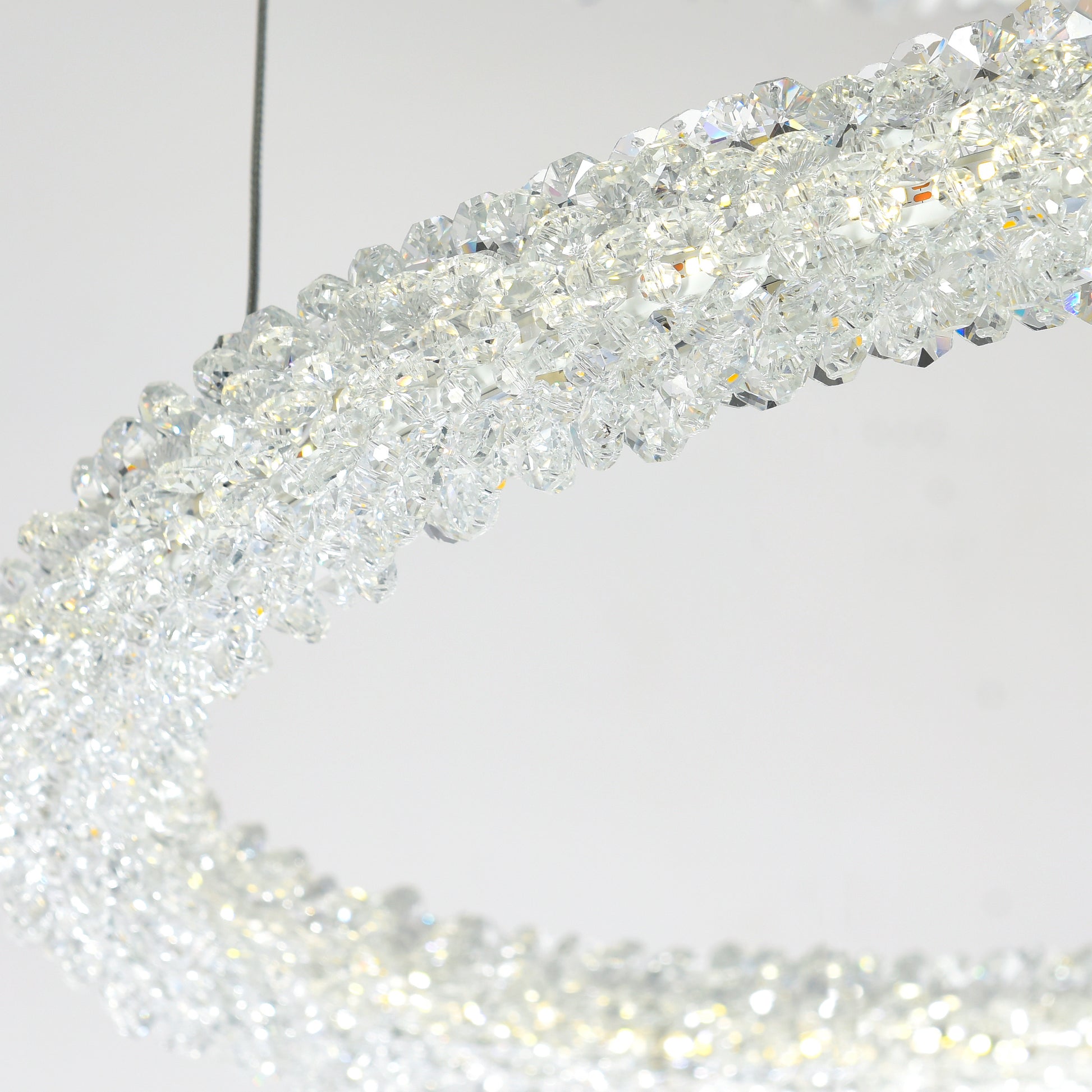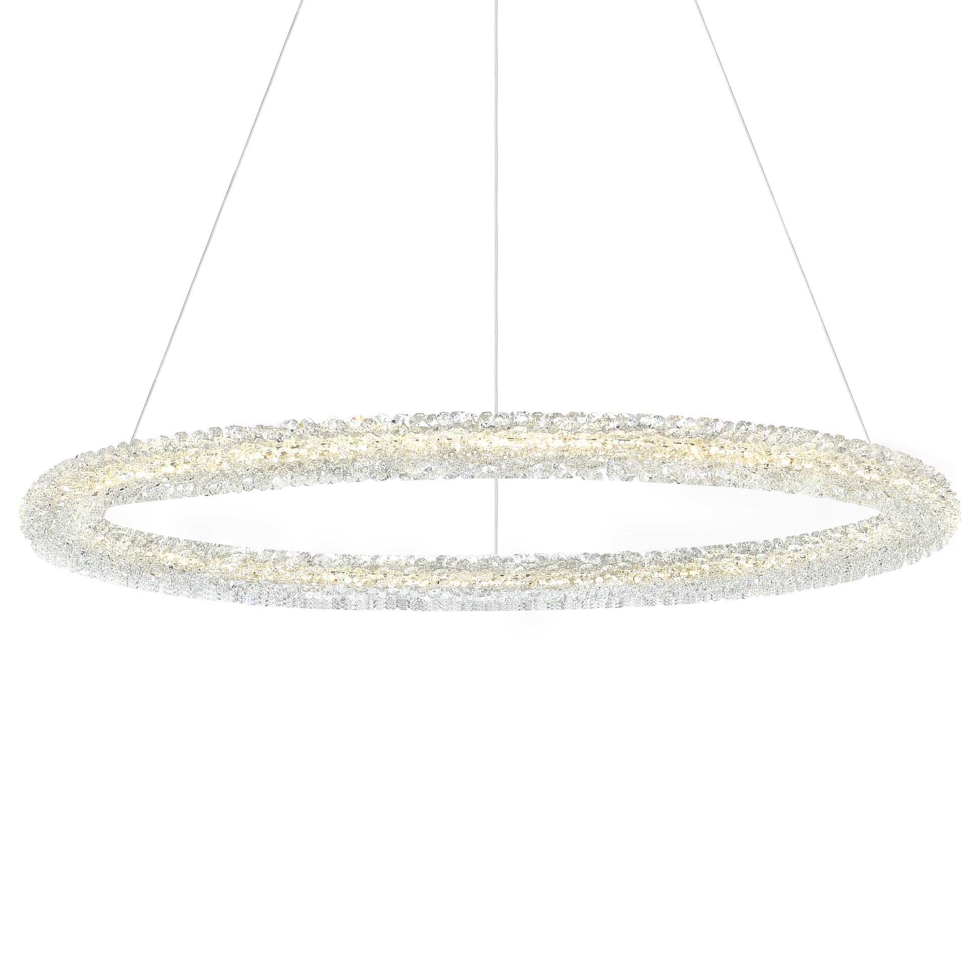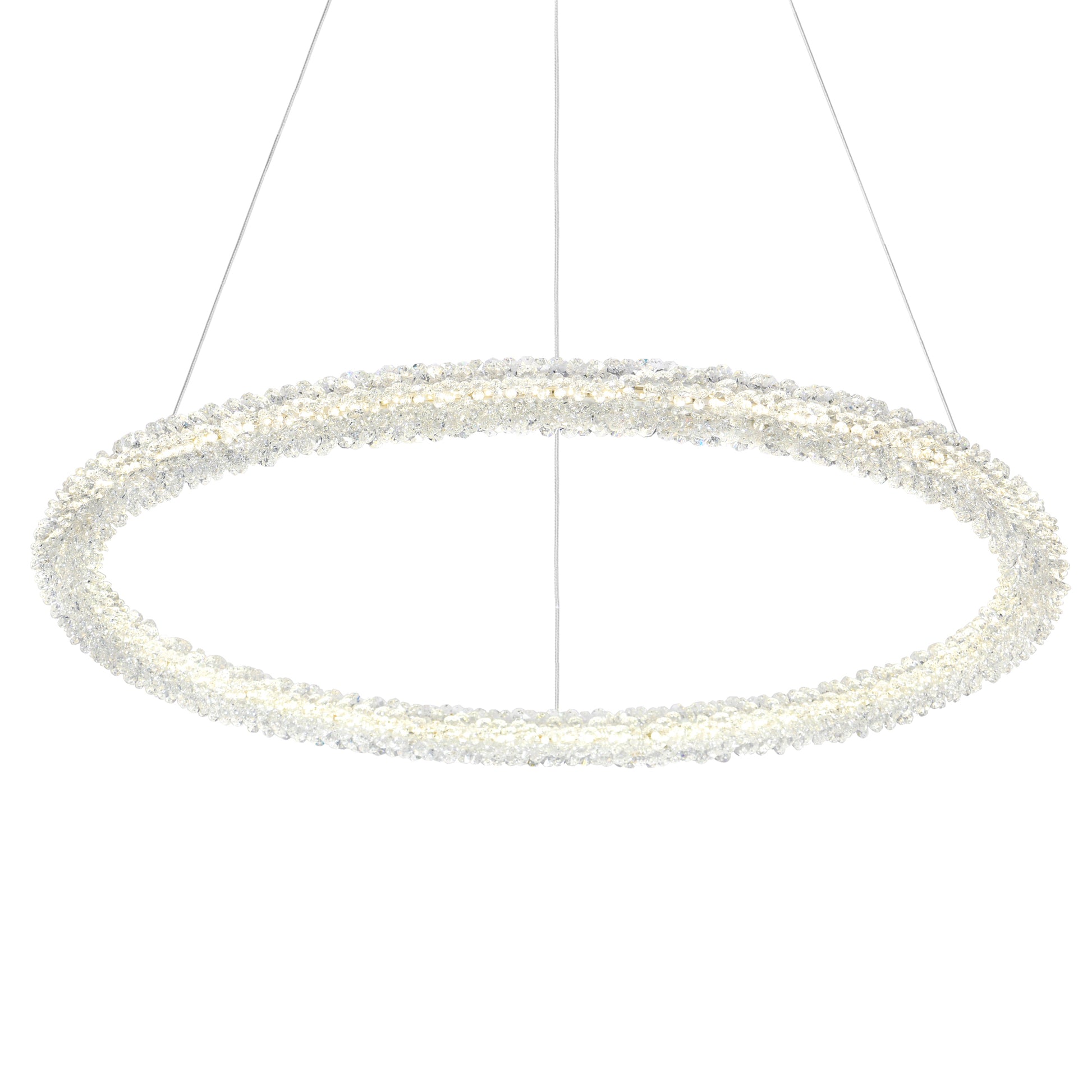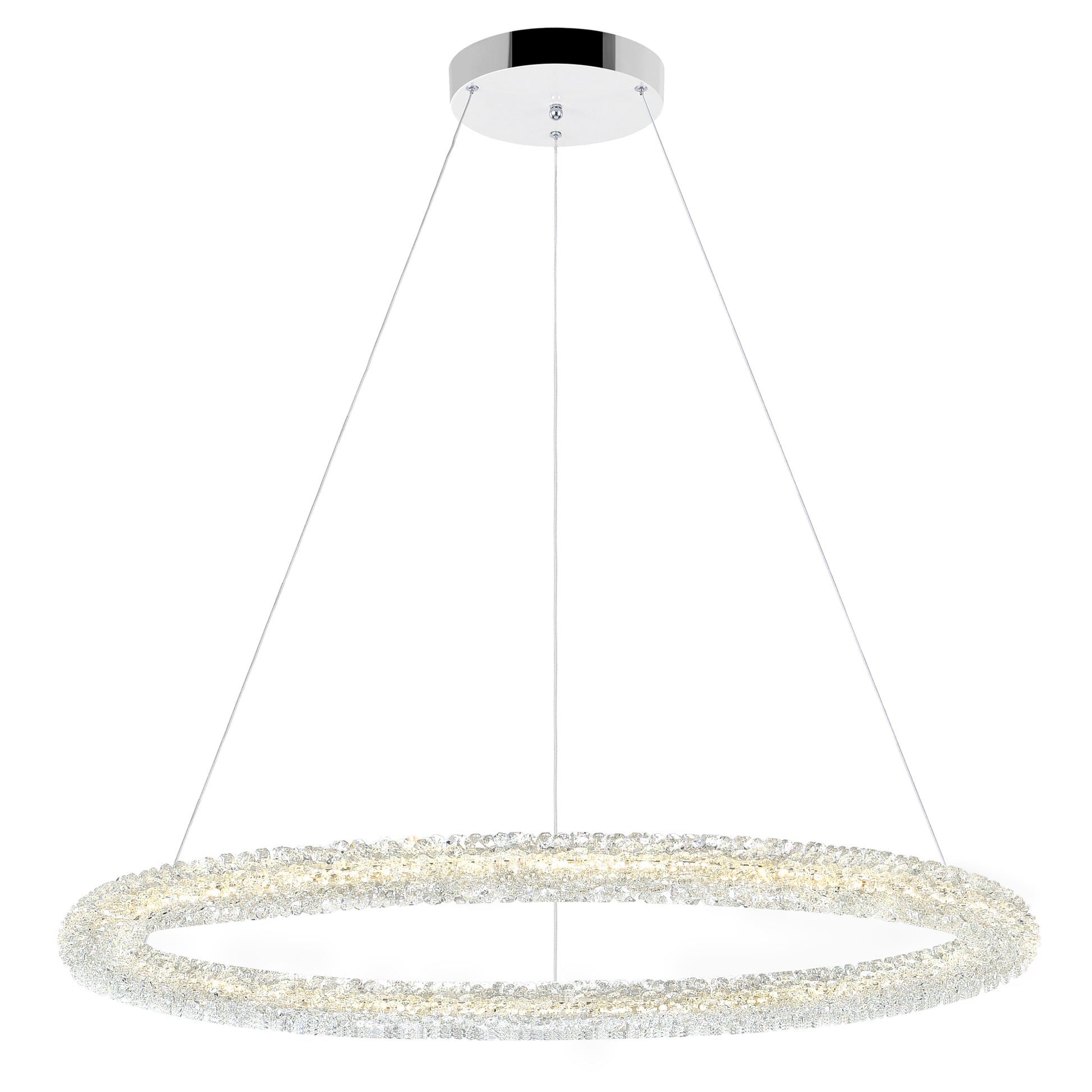 With a design that draws eyes upward, the Arielle 32 inch Single Halo LED Chandelier will dress your space with understated elegance. This ring of light in chrome finish displays a disc-shaped assembly of tiny clear crystals sparkling a soft yet luxurious twinkle. This large, hardwired, and dimmable halo crystal chandelier casts light through its integrated LED bulbs.