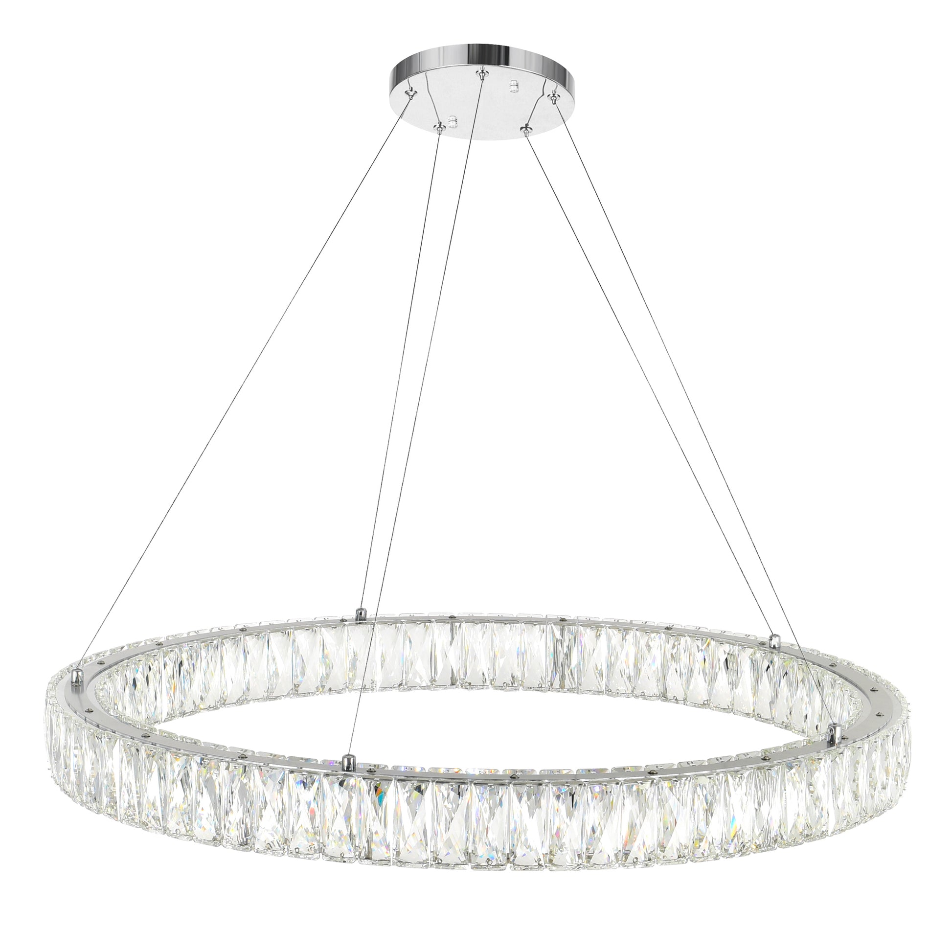 This halo chandelier is not to be missed. The Madeline 1 Ring LED Chandelier features a 3 inch thick round pendant measuring 32 inches in diameter. Its entire side is covered in faceted crystals that diffuse a brilliant but soft glow. Finished with chrome hardware, this decorative and functional fixture offers energy-efficient light and effortless elegance.