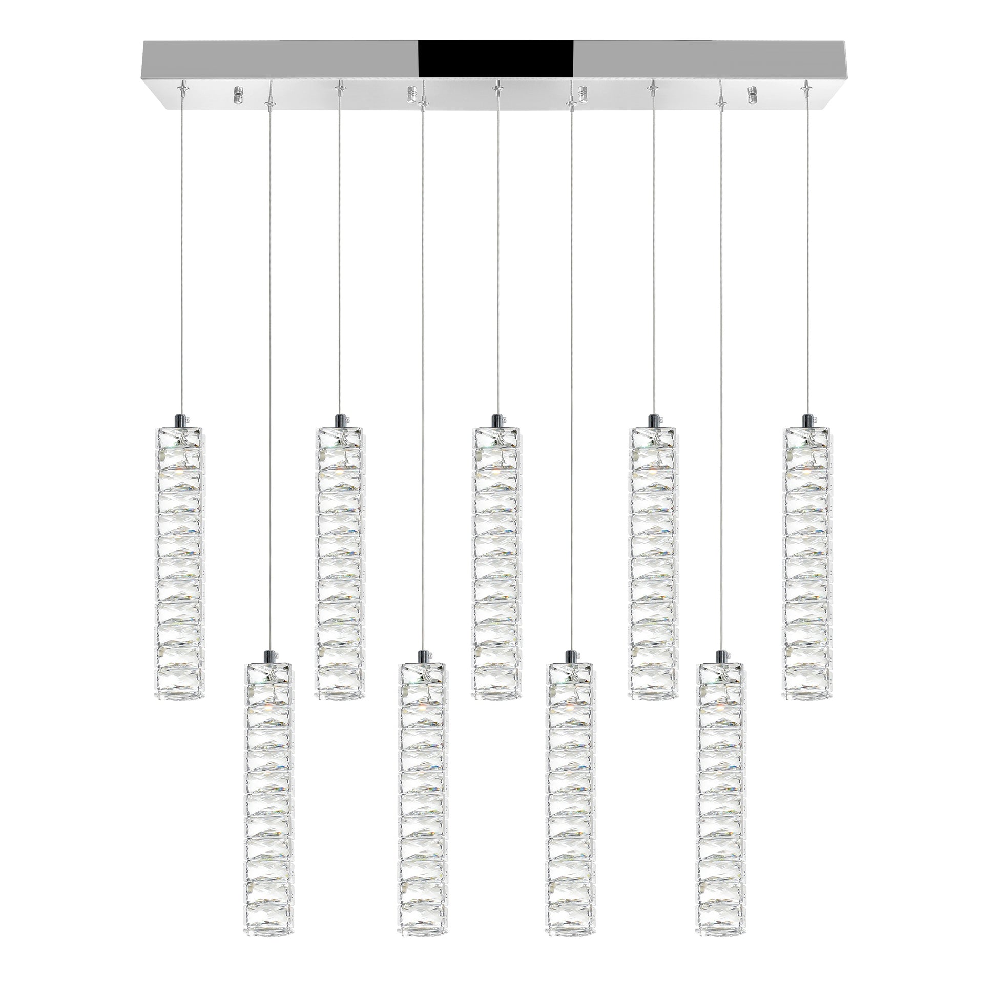 The 31 inch Celina 9 Pendant LED Chandelier can serve as a functional art piece in your living room or dining room. This pool table/island light is designed with a rectangular canopy in chrome holding glittering bars of light. This is an oversized chandelier that will provide your space with energy-efficient illumination and an effortless style transformation. Cords are adjustable.