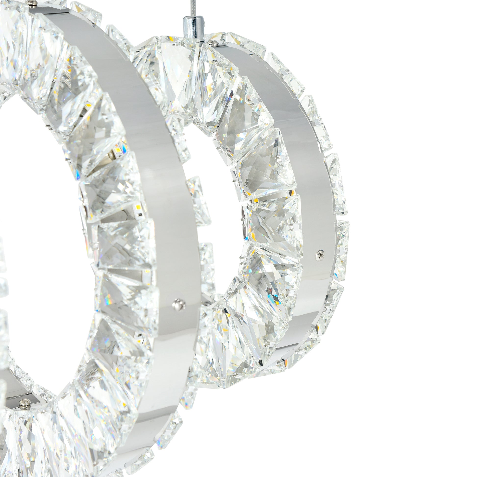 A modern chandelier with a twist. The oversized Celina LED Chandelier will wow you and your guests with its massive brilliance. Interlocking rings of varying sizes suspend, in vertical oriental, from a round chrome canopy. This glistening chandelier shimmers with an elegant sparkle that works in contrast with the fiery glow of a fireplace.