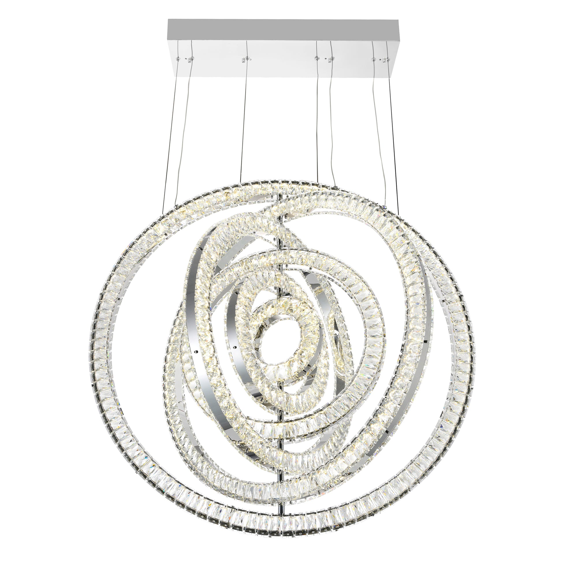 This shapely 37 inch Celina LED Chandelier can effortlessly reinvent the look of your living space. It features a glittering pendant with a silhouette reminiscent of an archery target. This round pendant allows you to subtly play with shape and scale while keeping your decor refined and stylish.