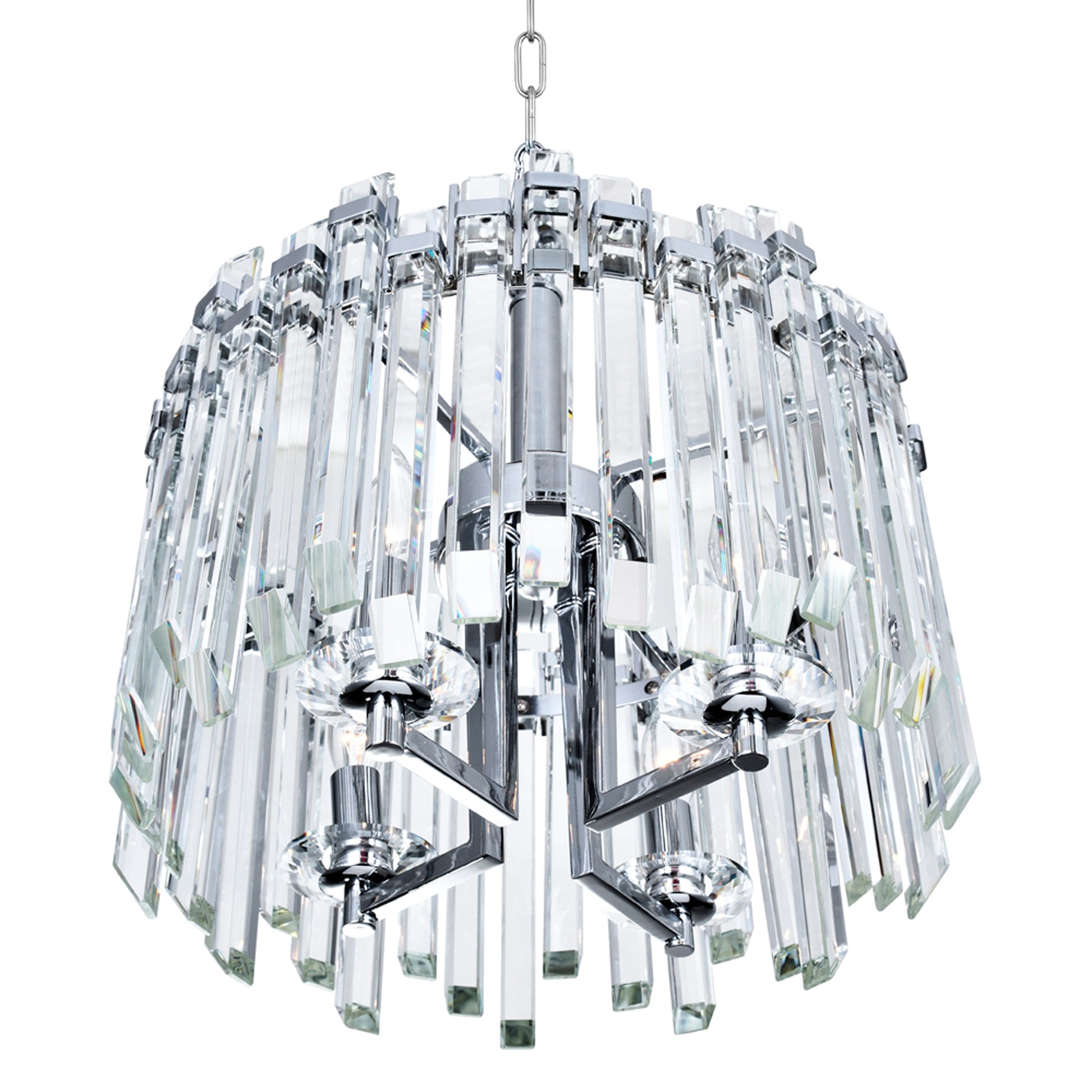 If you're looking to add a dazzling appeal to your space, the Henrietta 4 Light Chandelier may be the answer. This chrome chandelier displays a glamorous look with its clear crystal bar pieces that form a drum-like shade. The sparkling drum-like pendant is held by a chrome-finished chain suspending from a round canopy. This medium-sized light fixture measures 16 inches in diameter and requires four candelabra-based bulbs.