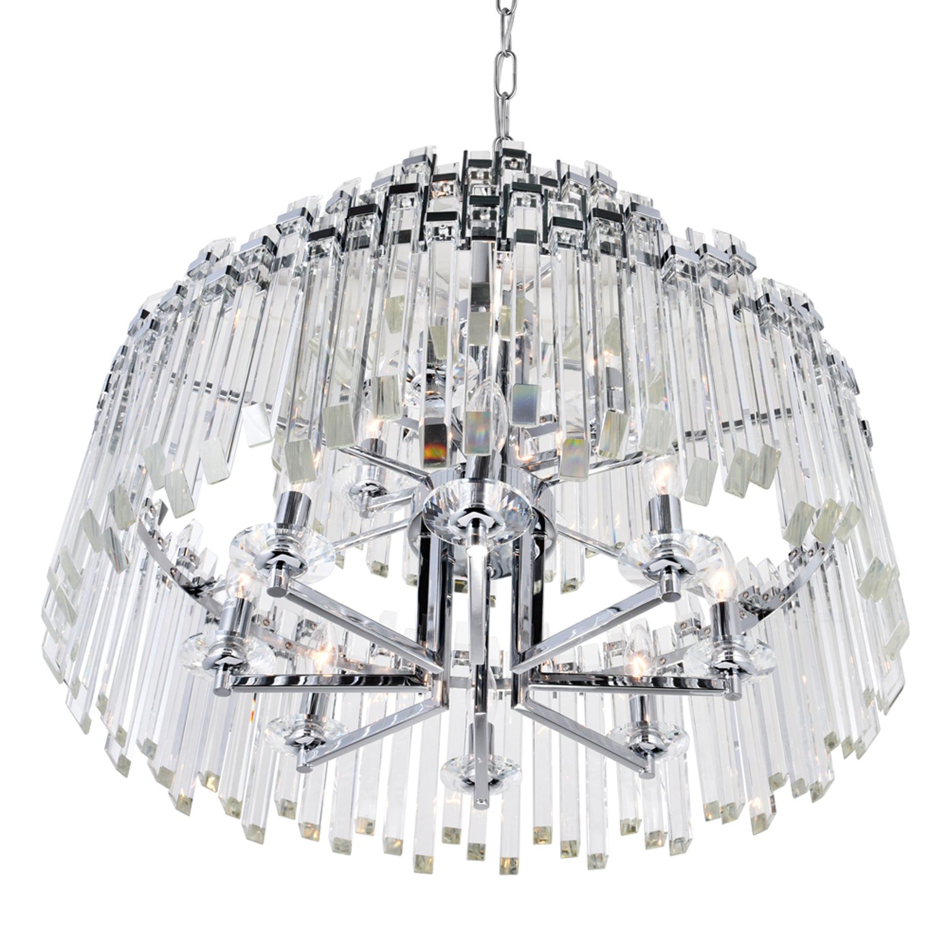 Dressed in clear crystals, the Henrietta 12 Light Chandelier delivers a charming play of light. Hidden inside two circular rows of crystals is a two Tiered candelabra base with twelve bulbs. The slender crystal bars refract light and cast a stunning glow that will make any space shine. This ornamental and functional light fixture is sure to make a dazzling piece for your interiors.