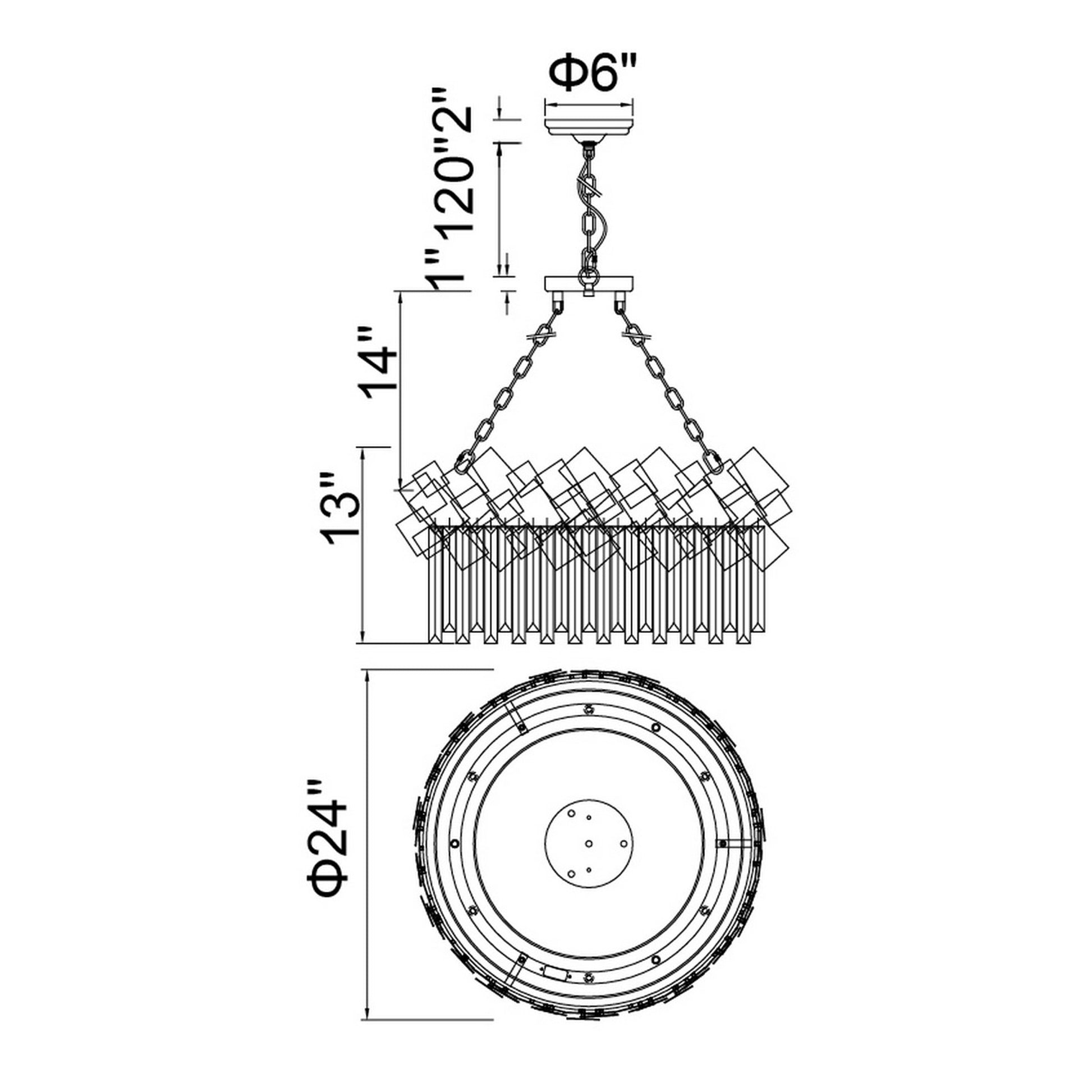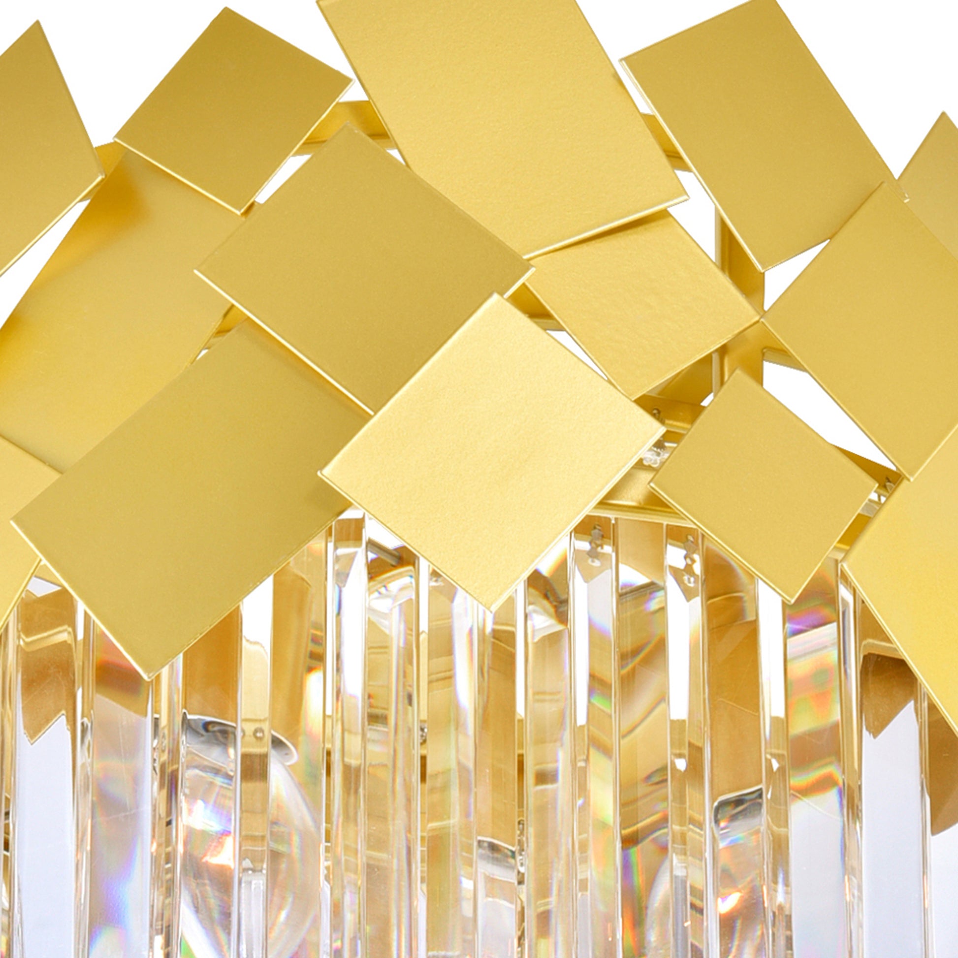 Be impressed by how this light fixture creates art and light in unison. The Panache 6 Light Chandelier in Medallion Gold is a 24 inch down chandelier that will grace your space with a gorgeous glow. It features an elegant drum shade made up of a golden patchwork of metal squares and rectangles. Clear crystal prisms drip off from the gold frame. Inside, six candelabra-based bulbs disperse ambient light to your space.