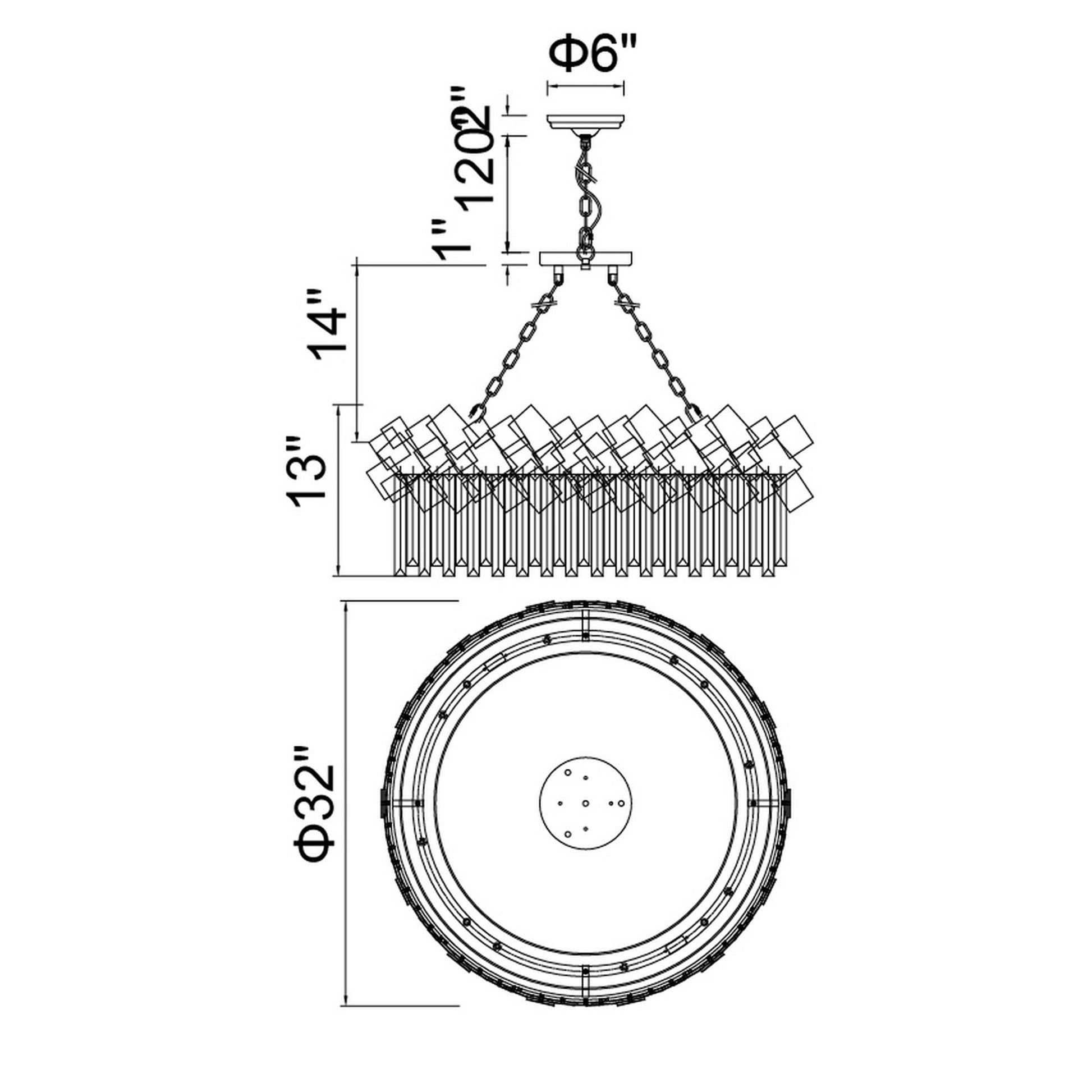 Transform an uninspiring space into a room you never want to leave by installing the Panache 8 Light Chandelier in Medallion Gold. This down chandelier is designed with a golden drum shade held by a golden chain. The 32 inch circular frame is covered with patches of metal square and rectangular cut-outs in medallion gold finish. Dripping from the round golden frame are clear crystal prisms that reflect the light provided by eight candelabra-based bulbs.