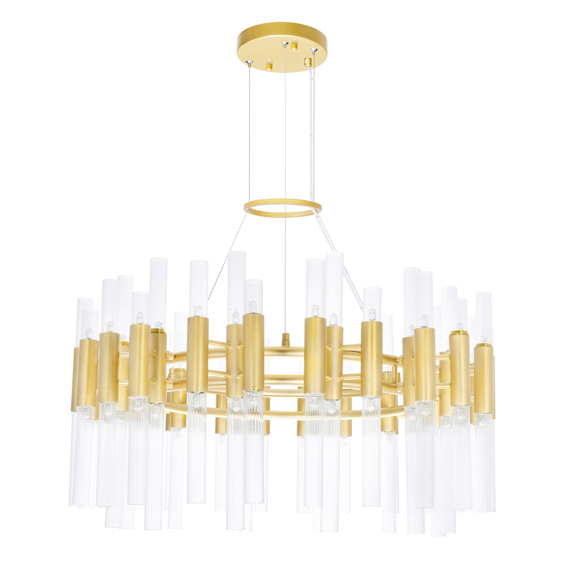 Make a bold statement with the Orgue 72-Light Chandeliera stunning blend of contemporary design and luxurious elegance. Its impressive 32-inch size and vibrant, cascading lights create a captivating focal point in any room. The satin gold finish adds a touch of sophistication, while its weightless, floating design brings modern charm to your decor. Perfect for illuminating a dining room, kitchen island, or grand entryway, this chandelier casts a warm, inviting glow that enhances your space.