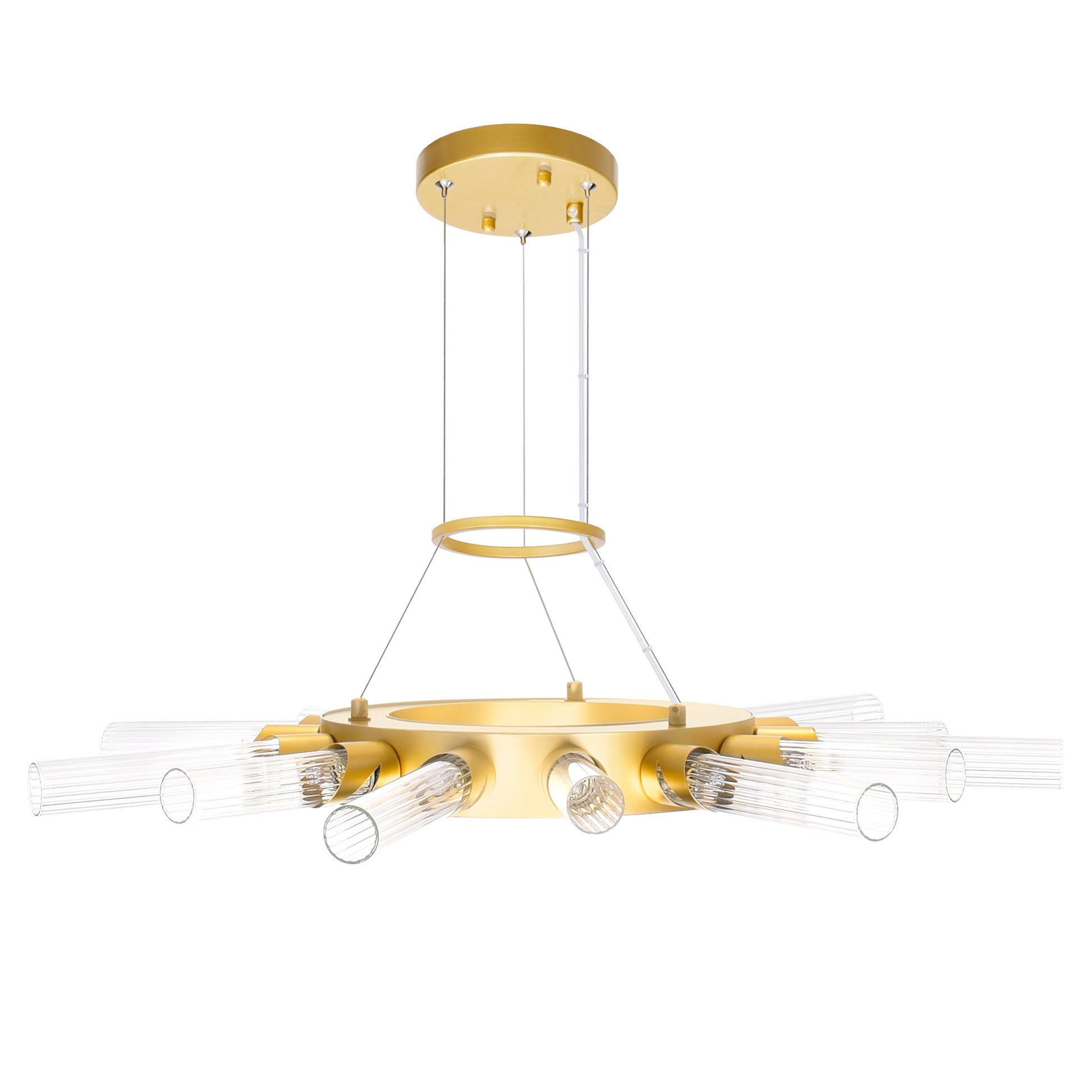 Both edgy and sophisticated, the Collar 14 Light Chandelier has the functionality and style presence that can benefit any setting. It features a satin gold circular metal band measuring 28 inches in diameter. Around it are cylindrical tube glasses serving as shades that diffuse light throughout the space. This modern and futuristic light fixture can bring a designer inchspired touch to any interior.