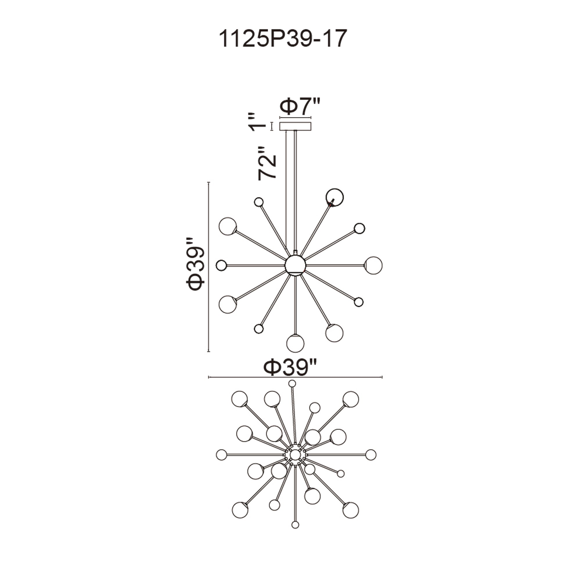 The Element 17 Light Chandelier is an oversized 39 inch luminaire with a space-age Sputnik style. This funky light fixture comes in polished nickel finish and features 17 frosted glass globe shades. The spoke-style arms are sure to grab glances as it gives your space a bold, new look. Add this versatile light fixture to a bedroom, living room, or hallway and see it make a lasting impression.