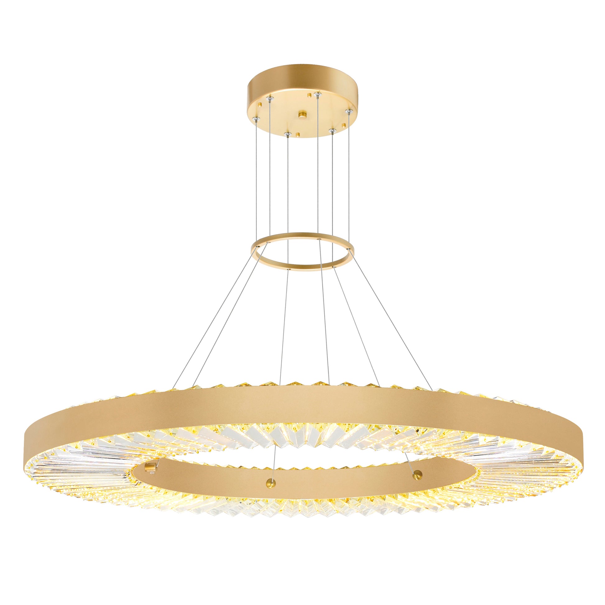 A functional dining room or living room chandelier with a circular shape, the oversized Bijoux 32 inch LED Chandelier in sun gold will certainly capture the attention of your guests. This light fixture reflects the sophistication of clear crystals and the contemporary flair of geometric luminaires. Add instant drama to your living space with this sun gold finished circular LED chandelier.