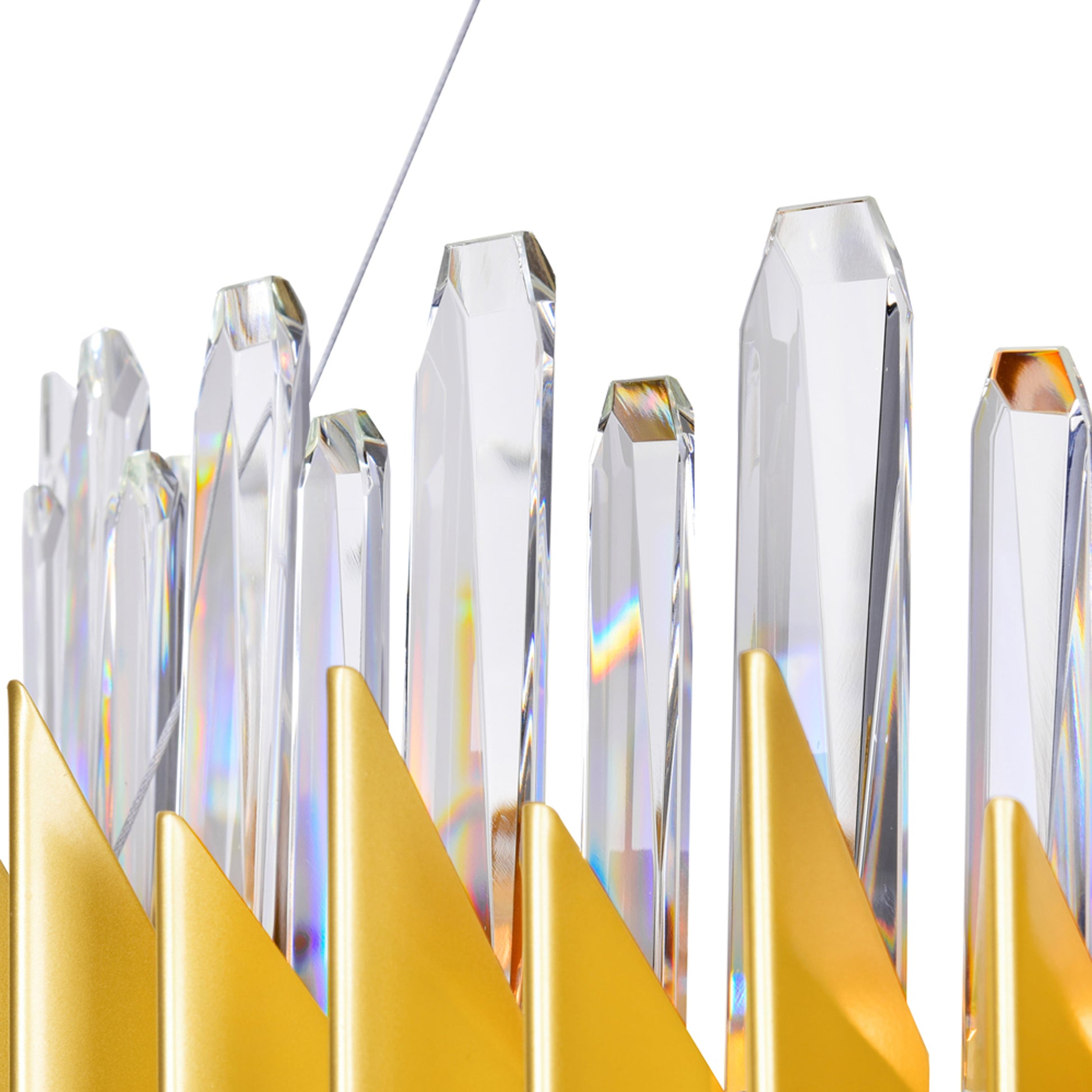 A bright focal point for your modern white living room, the Cityscape 24 Light Chandelier gleams with modern elegance. Finished in satin gold, this round chandelier measuring 39 inches in diameter has clear crystal prisms connected to a golden metal frame in zigzag motif. This is the perfect luminaire to bring an architectural character to a cookie-cutter home.