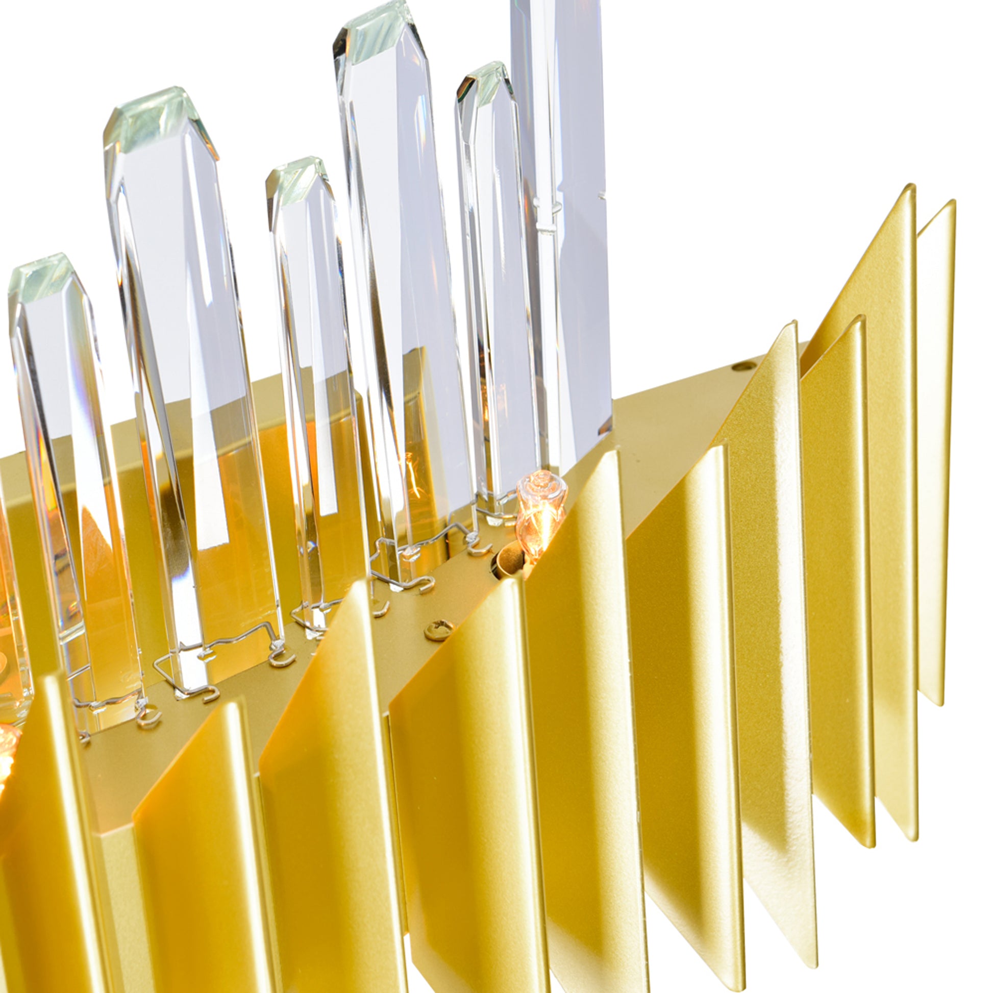 Add some urban glam to a dull area in your home with this Cityscape 5 Light Wall Sconce. Finished in satin gold, with zigzag motif, and decorative crystal prisms, this 12 inch tall wall light will offer an unexpected vibrance to any space. Switch up the atmosphere in your hallway, bedroom, or even bathroom by installing this luminous wall lamp.