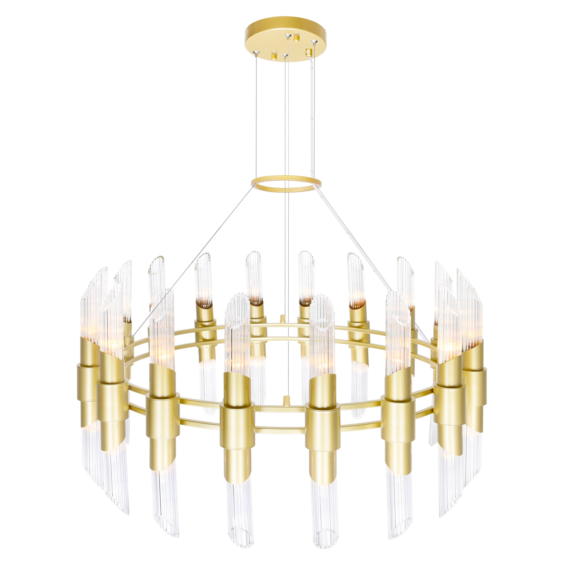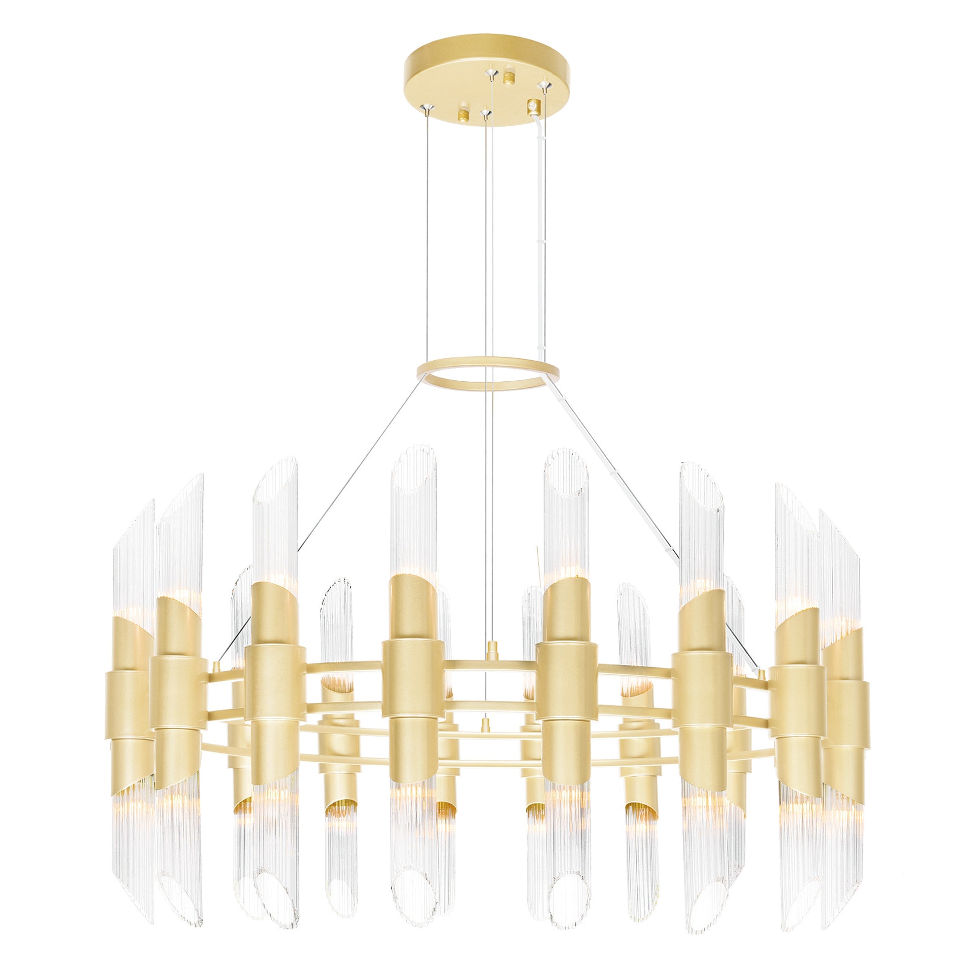 A dramatic, non-crystal chandelier perfect for your modern home. The Croissant 36 Light Chandelier features a satin gold round metal base with textured glass tubes for shade. This unfussy chandelier with simple yet notable detail will look at home in any room. Put it in the living room, dining room, kitchen or entryway and let it bring a hint of subtle sophistication to your space.