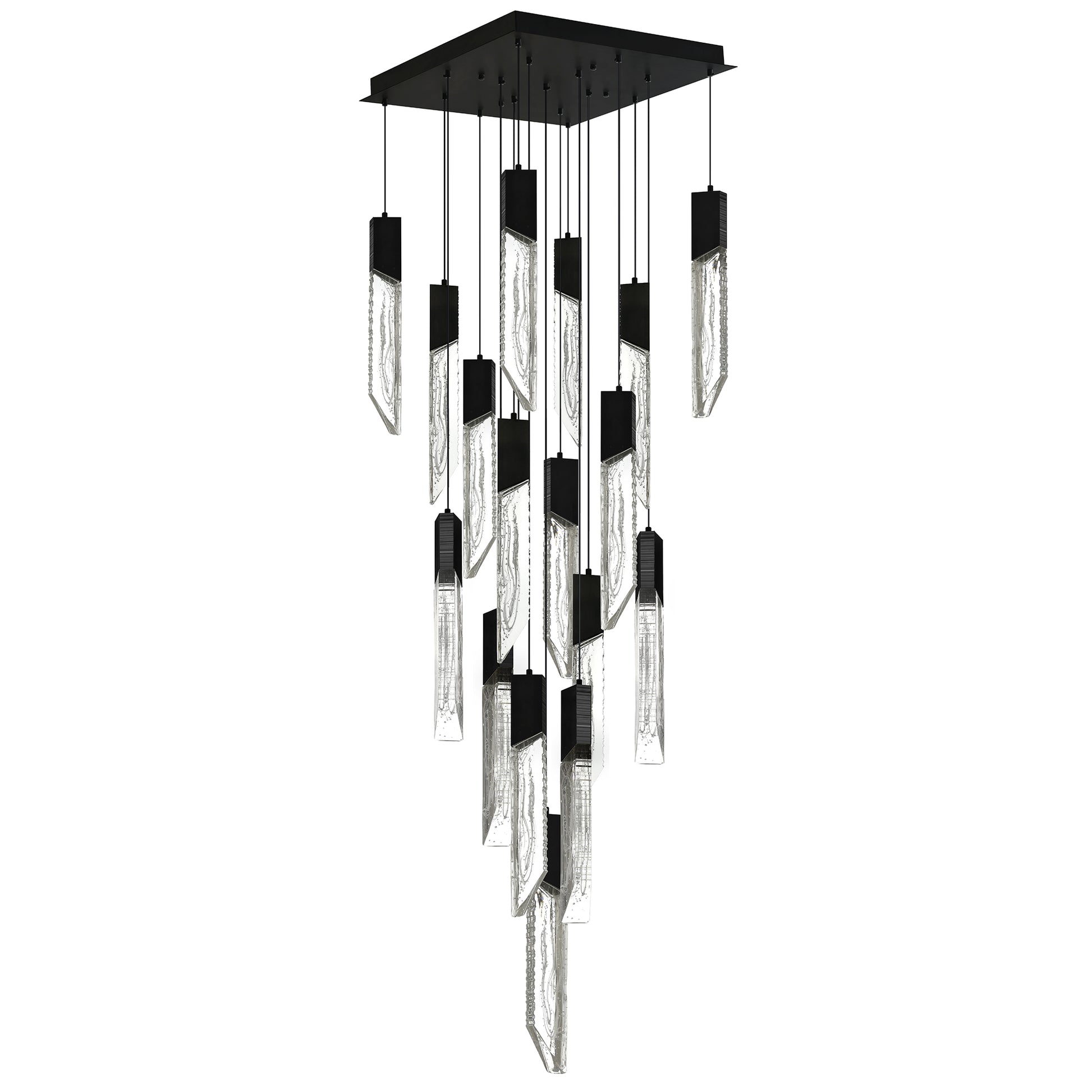 The Petra chandelier is designed to captivate. Suspended from a bold black canopy, its cascade of handcrafted glass pendants creates a dramatic interplay of light and texture. Each pendant glows with sculptural brilliance, transforming illumination into art. The Petra chandelier offers a fully adjustable color range from 2700K to 5000K, shifting effortlessly from warm, intimate tones to crisp daylight. A sleek remote control places the power of ambiance in your hands, ensuring every moment is lit to perfection. More than a fixture, this chandelier is a statement of modern luxury. It's an architectural centerpiece that elevates dining rooms, kitchen islands, and entryways with sophistication and presence.