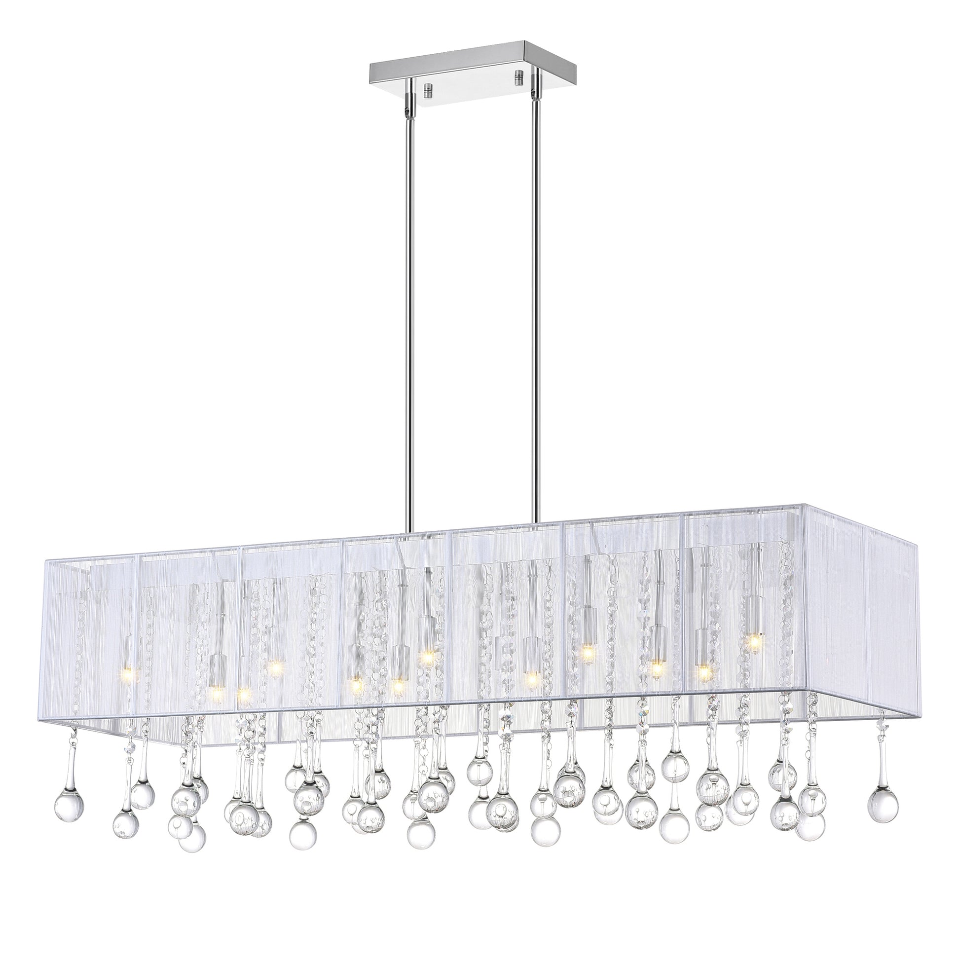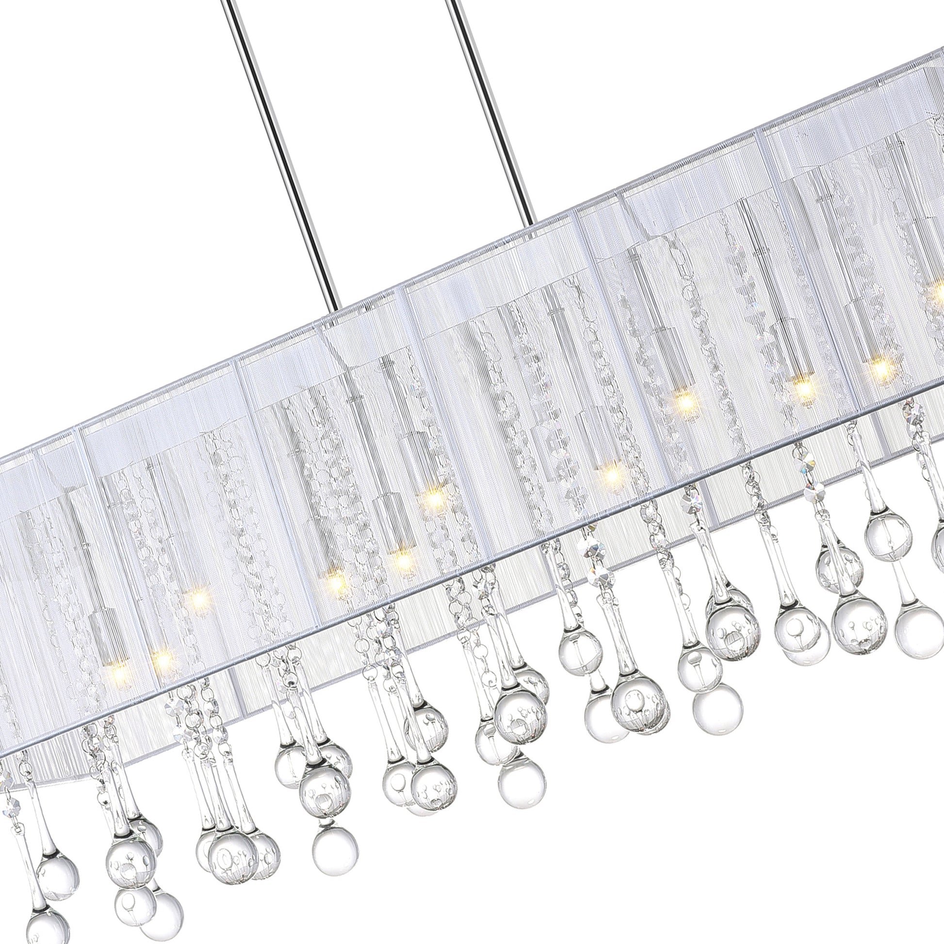 Let the Water Drop 14 Light Chandelier (Clear Crystal) lend a special atmosphere to your space. This glistening light fixture is designed with a 40 inch rectangular shade in white or silver. Dangling underneath are clear crystal droplets that radiate light. This is the exact finishing touch a modern but sterile space needs.