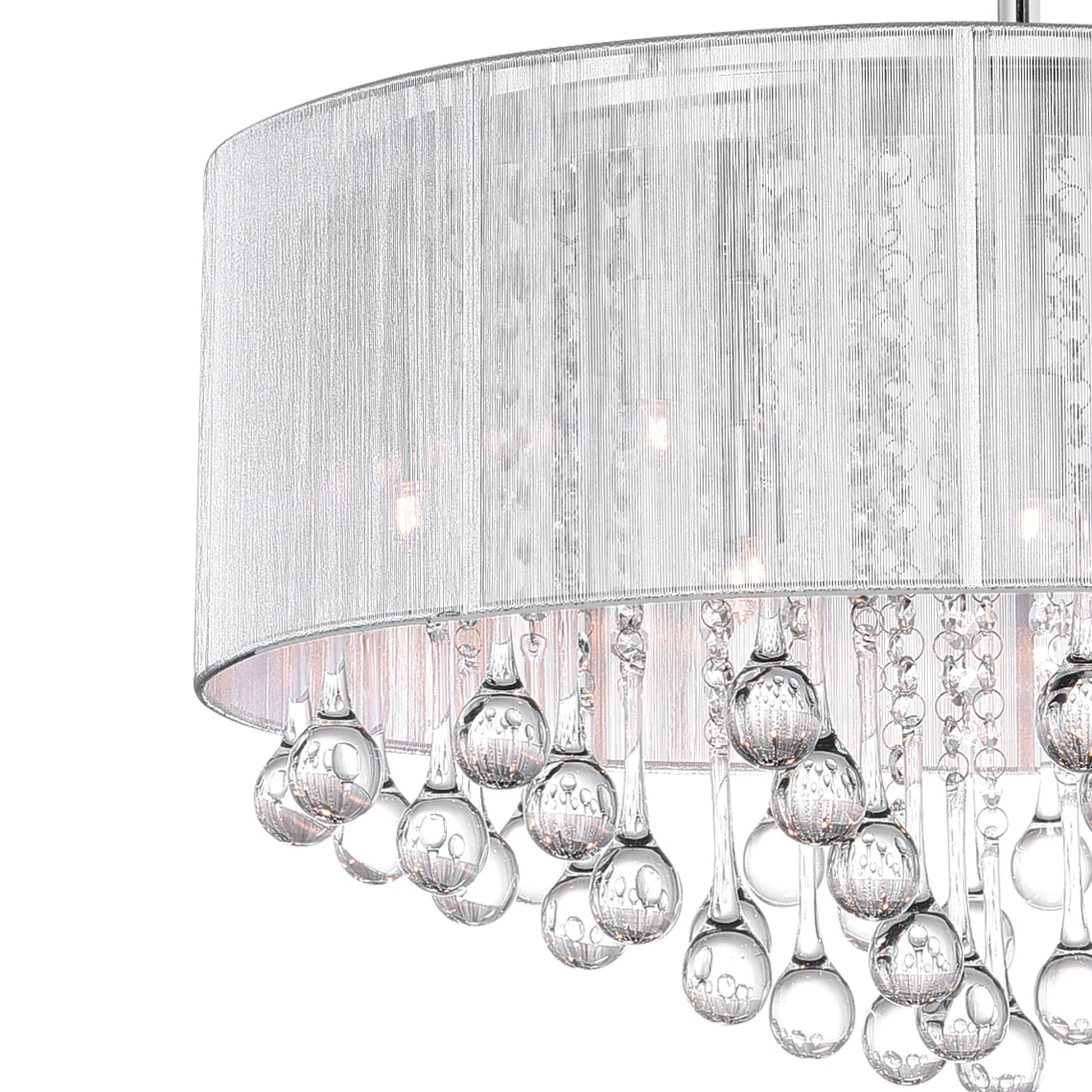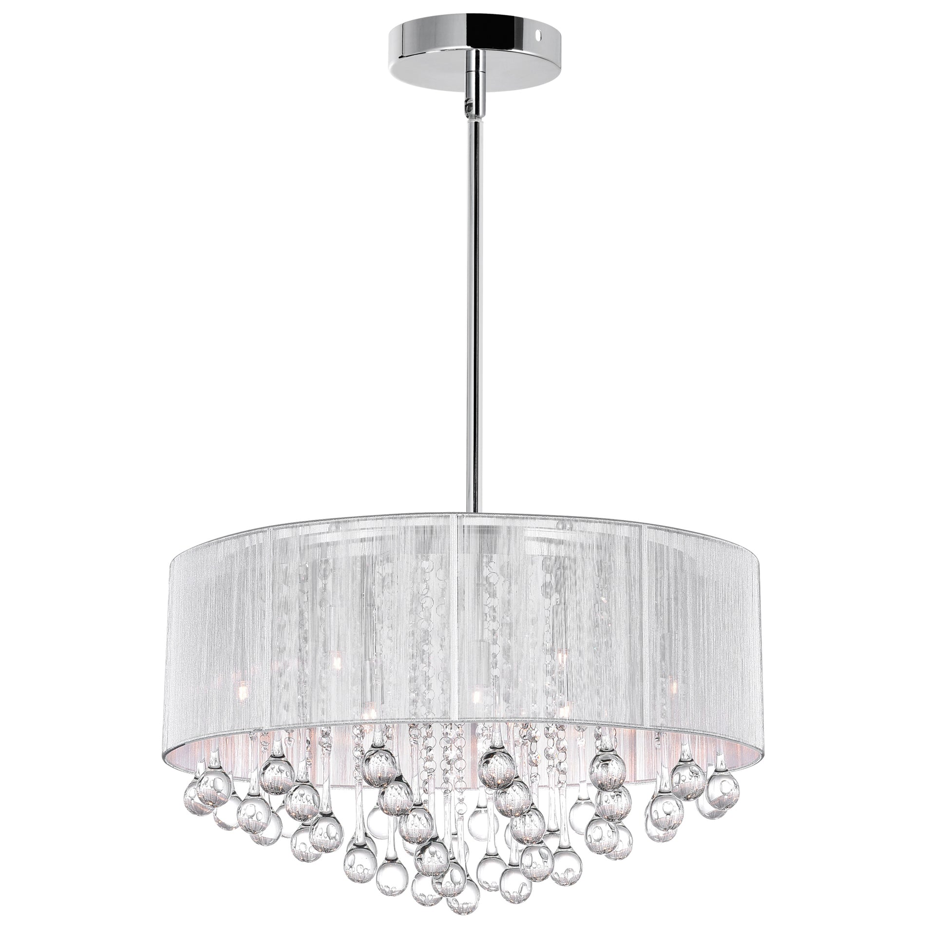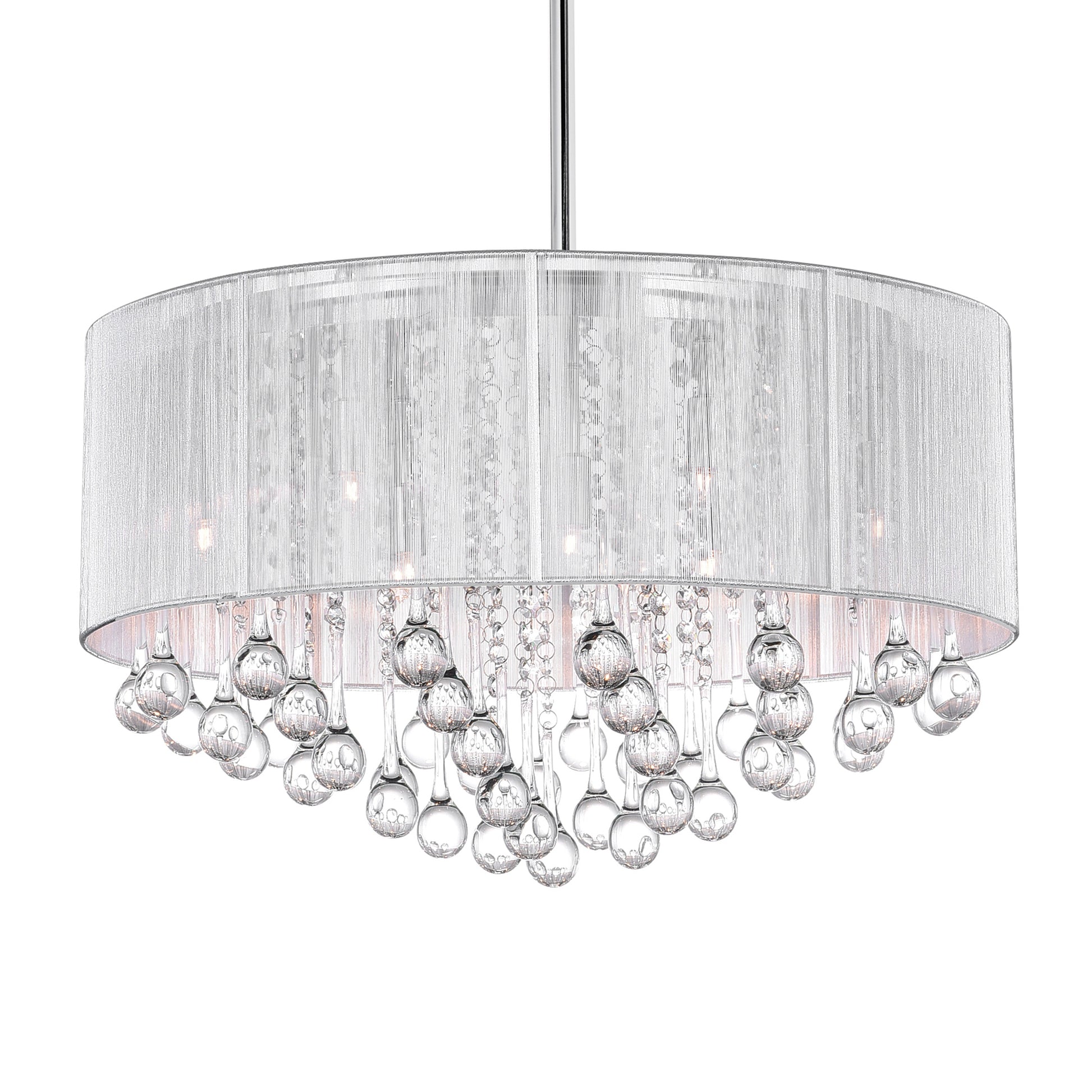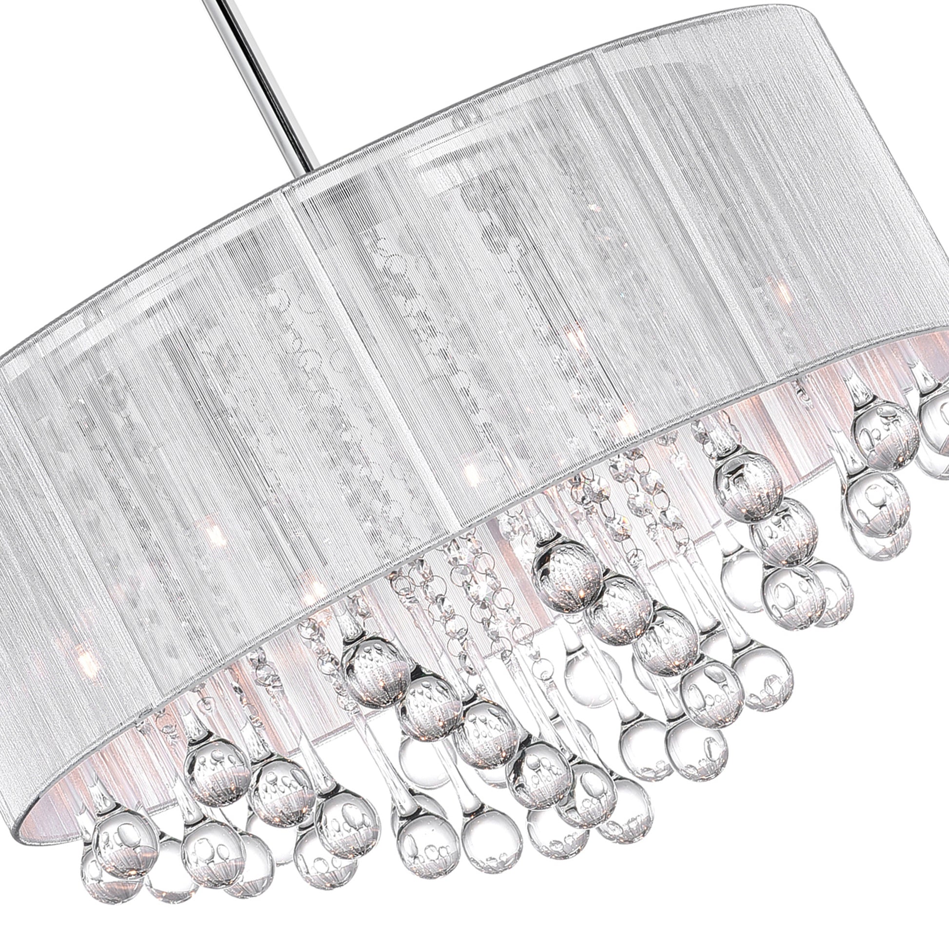 Quickly refresh the ambiance in your home by updating your lighting. Pick the Water Drop 9 Light Chandelier and allow its reflecting shimmer and sparkle add a dose of glam to your interiors. This drum shade chandelier features a 22 inch circular shade held by chrome-finished hardware. Hanging from the inside are charming crystal drops that diffuse light in sparkling finish.