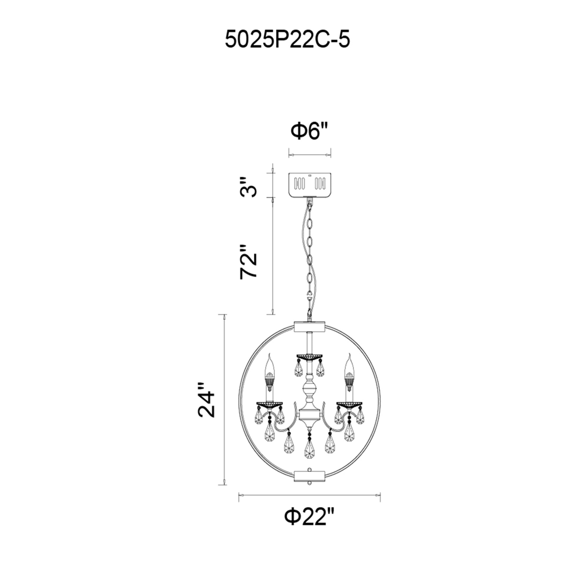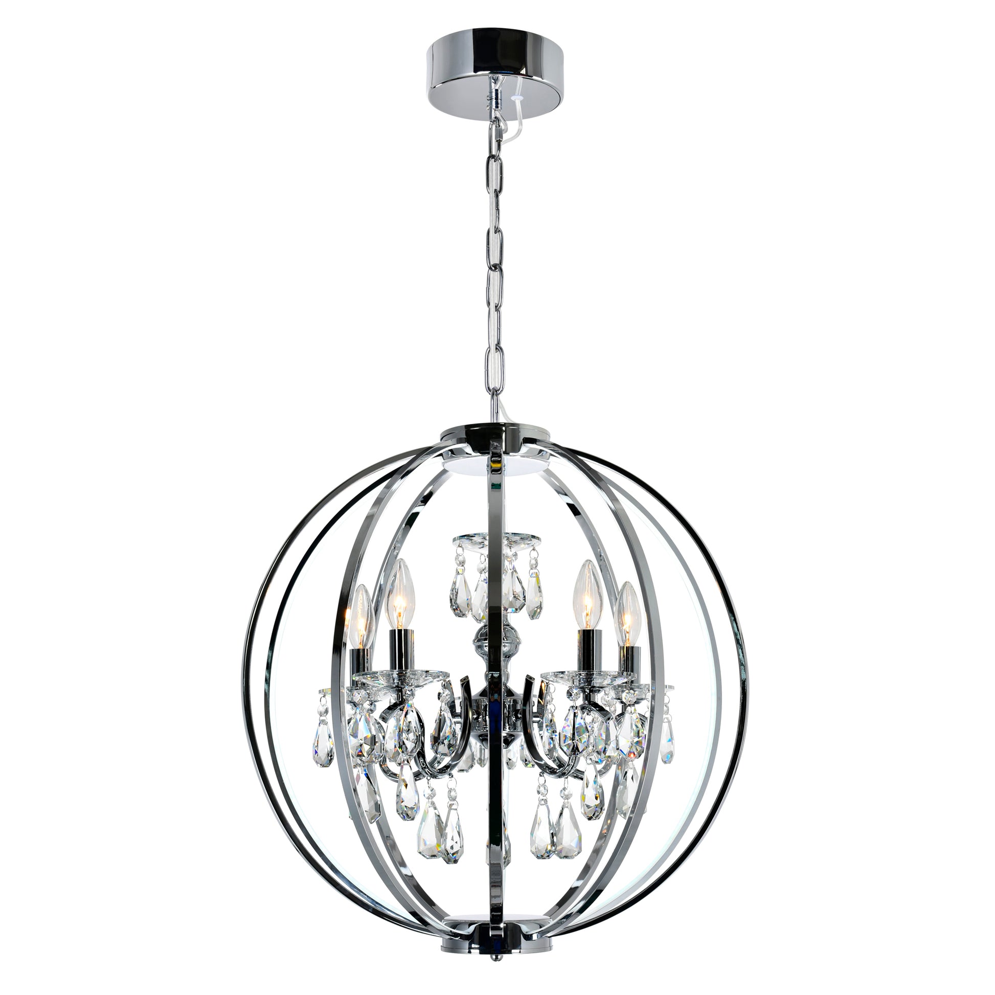 The Abia 5 Light Chandelier showcases a 22 inch spherical cage with five candelabra arms adorned with crystal bead drops. Offered in chrome finish, this lighting option can enhance the mood or ambiance in a space. Add this contemporary up chandelier to an unexpected place and watch it make the right statement.
