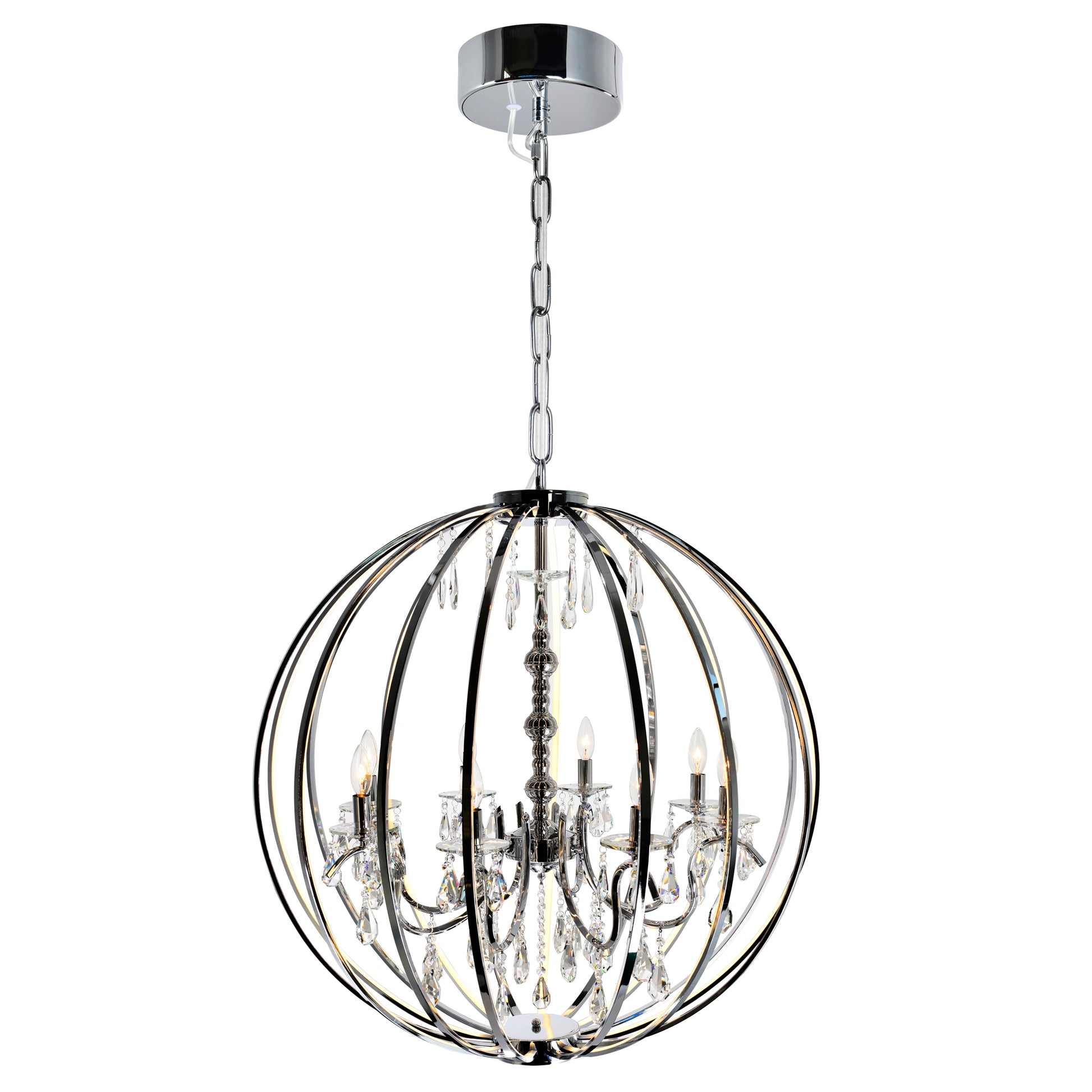 An oversized ball of character. The Abia 8 Light Chandelier stands out with its distinctive form. A 35 inch chrome orbit houses an eight-arm candelabra frame embellished with dangling crystals. This light fixture delivers cozy, warm light while displaying a vintage yet modern appeal and a chic style all at the same time. Although it is dynamic in appearance, it still looks easy on the eyes with its elegant profile.