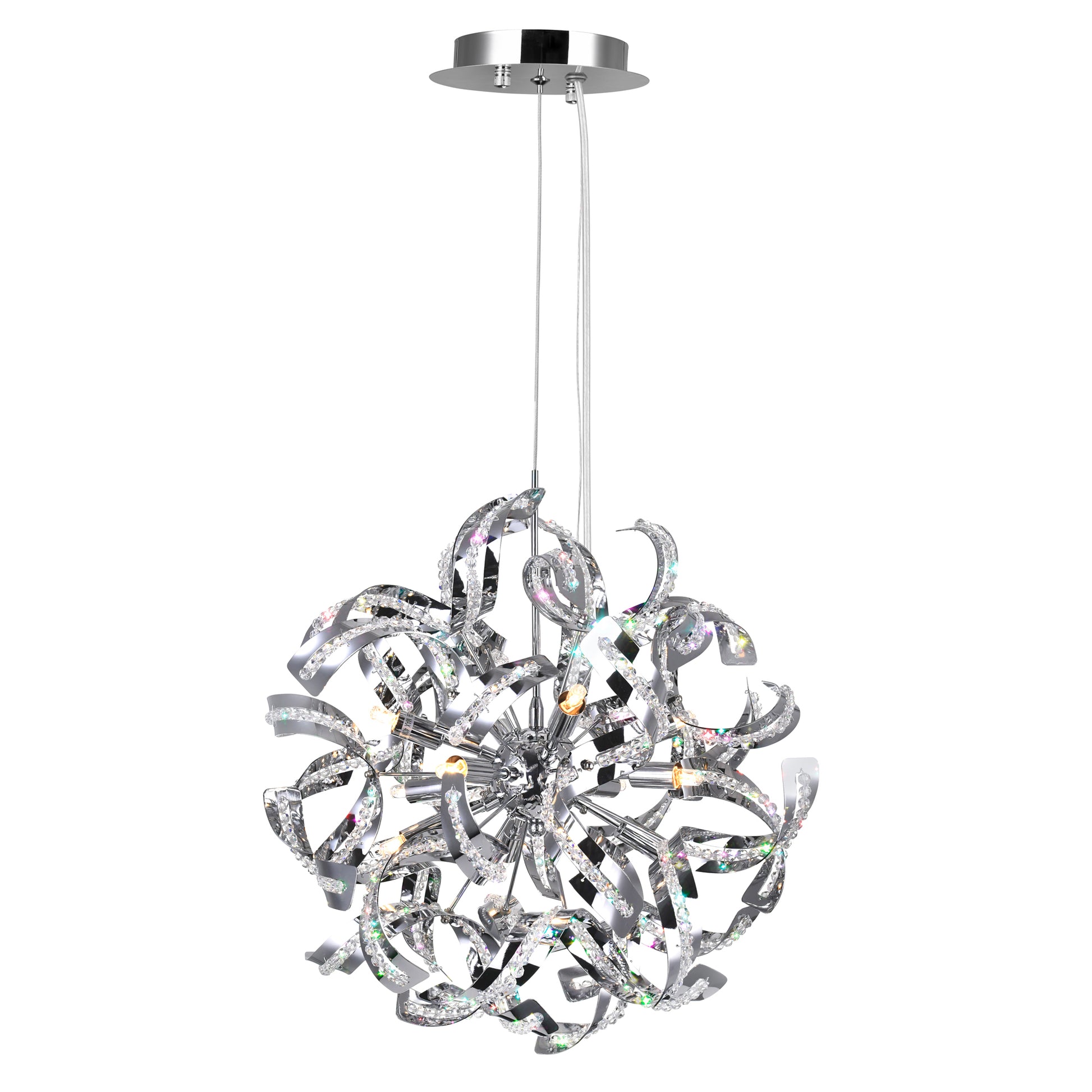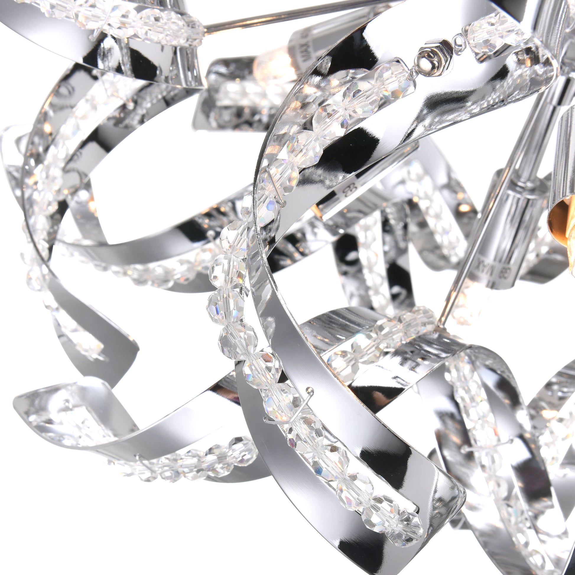 Heres a glamorous lighting option that makes a statement without overwhelming your space. The Swivel 18 Light Chandelier features a unique round design accented with delicate ribbons of clear crystals. Each metal swirl adds a touch of sparkle, while bi-pin bulbs (sold separately) provide a soft, twinkling glow. This chandelier is the perfect choice to brighten your ceiling with elegant, shimmering light.