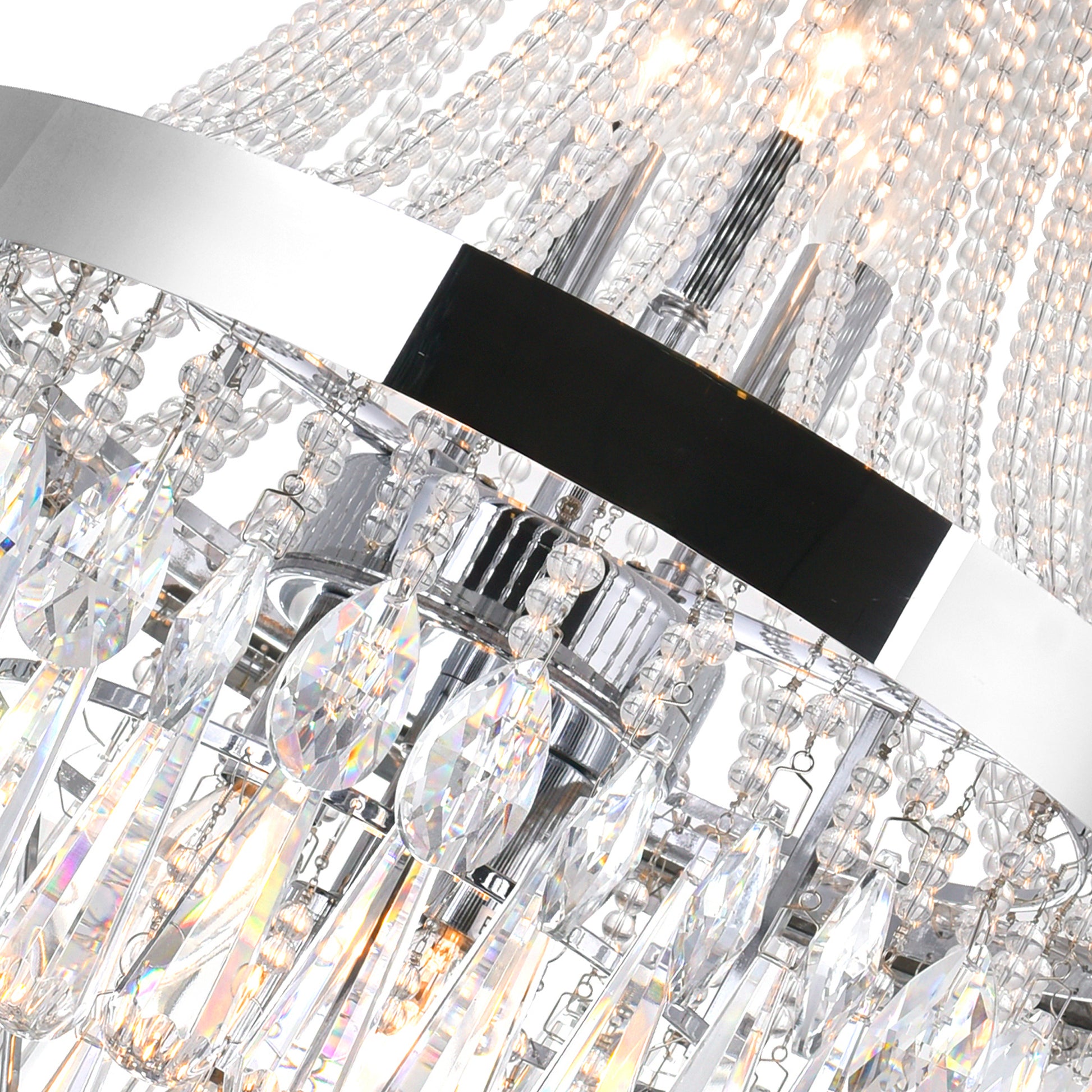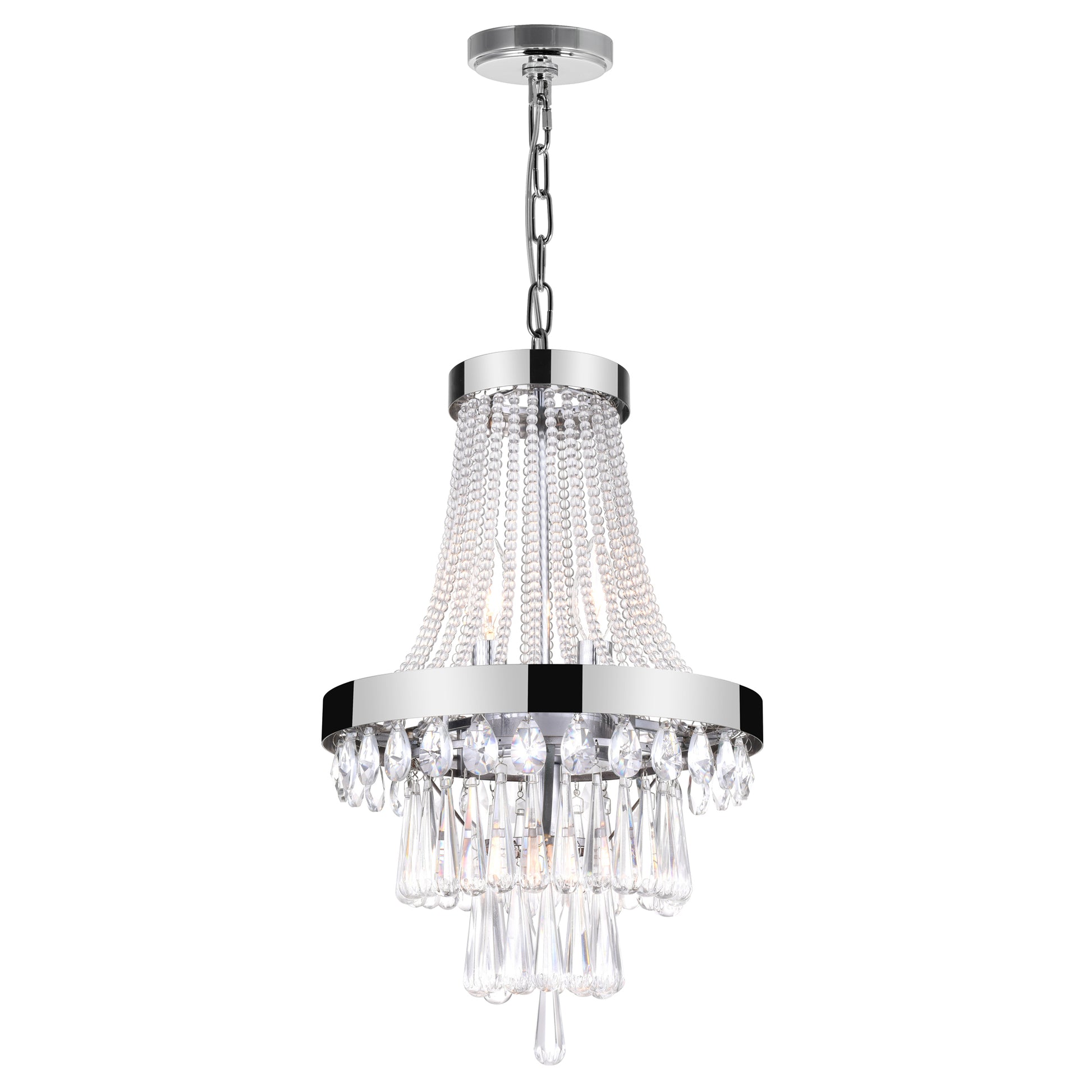 The Vast 3 Light Pendant will captivate you with its brilliance. Although compact in size, this 12 inch crystal chandelier is capable of drawing eyes with its chrome metal frame, cascading strands of mini crystals, and dripping clear crystal beads. This light source is perfect for those who wish to add elegance to their space with something that is a little more demure.