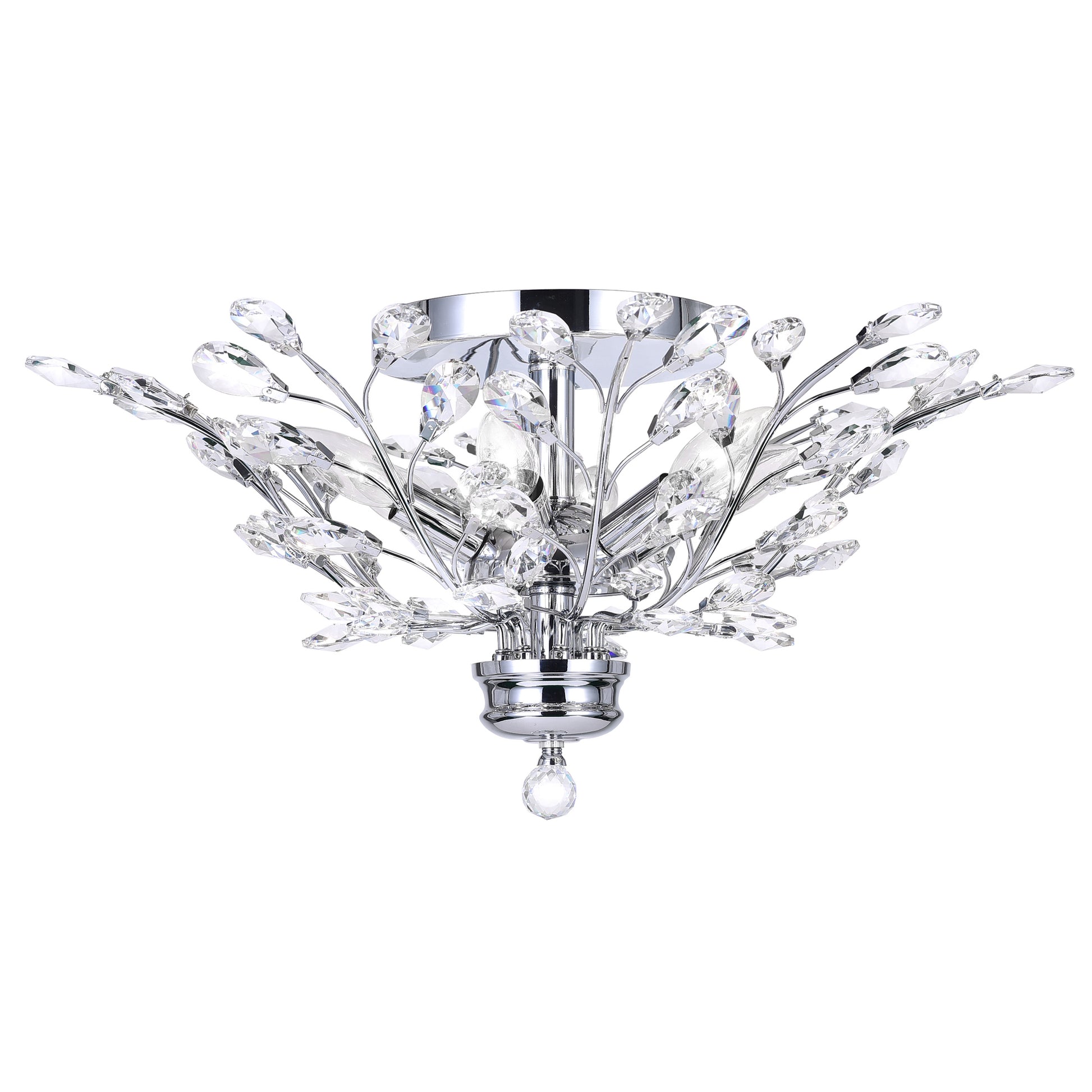 Bring a touch of whimsy to your space with the Ivy 6 Light Flush Mount, featuring vine-like chrome stems and dazzling faceted clear crystals that mimic glistening leaves. This elegant lighting fixture casts a sparkling glow, adding charm and brilliance to any room. Perfect for entryways, bedrooms, or dining areas, it combines nature-inspired design with modern sophistication. Upgrade your decor with this eye-catching piece that effortlessly blends style and illumination.