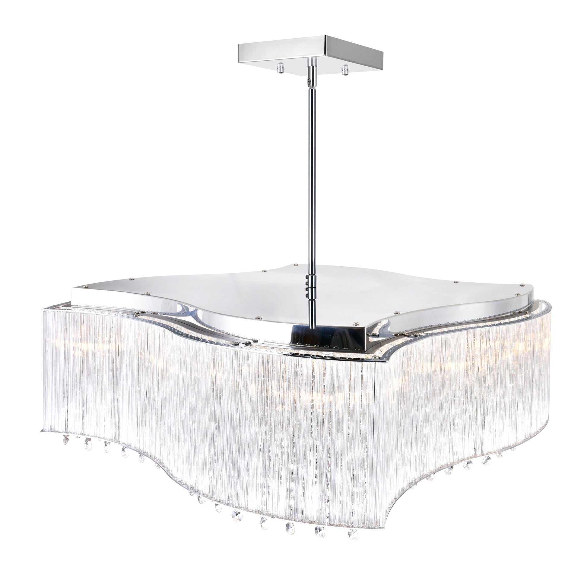 Add depth and drama to a dark room with the warm light cast by this glam drum shade chandelier. The Elsa 10 Light Chandelier features a glass shade with chrome-finished rims and strands of crystal beads dripping from the inside. This luminaire will shimmer elegantly in your living room, dining room, or kitchen.