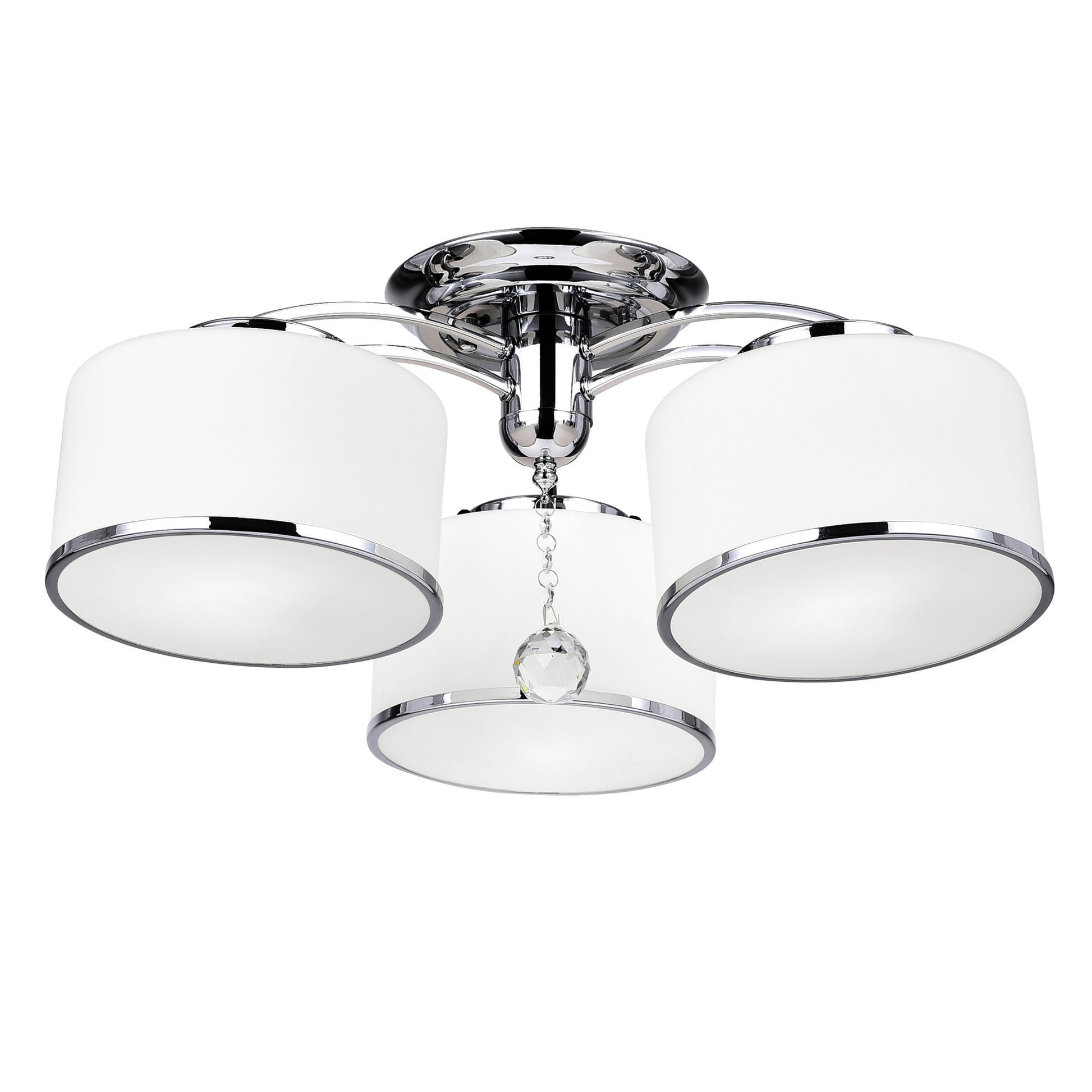 Brighten up a high-traffic area with ample illumination and some modern style. Use this Frosted 3 Light Flush Mount in the living room, dining room, or entryway and let its three drum shades cast a beautiful glow over the space. The base is crafted in metal with polished chrome finish. The three drum shades are in off-white glass. A clear crystal ball dangle at the center for a playful touch of sophistication.