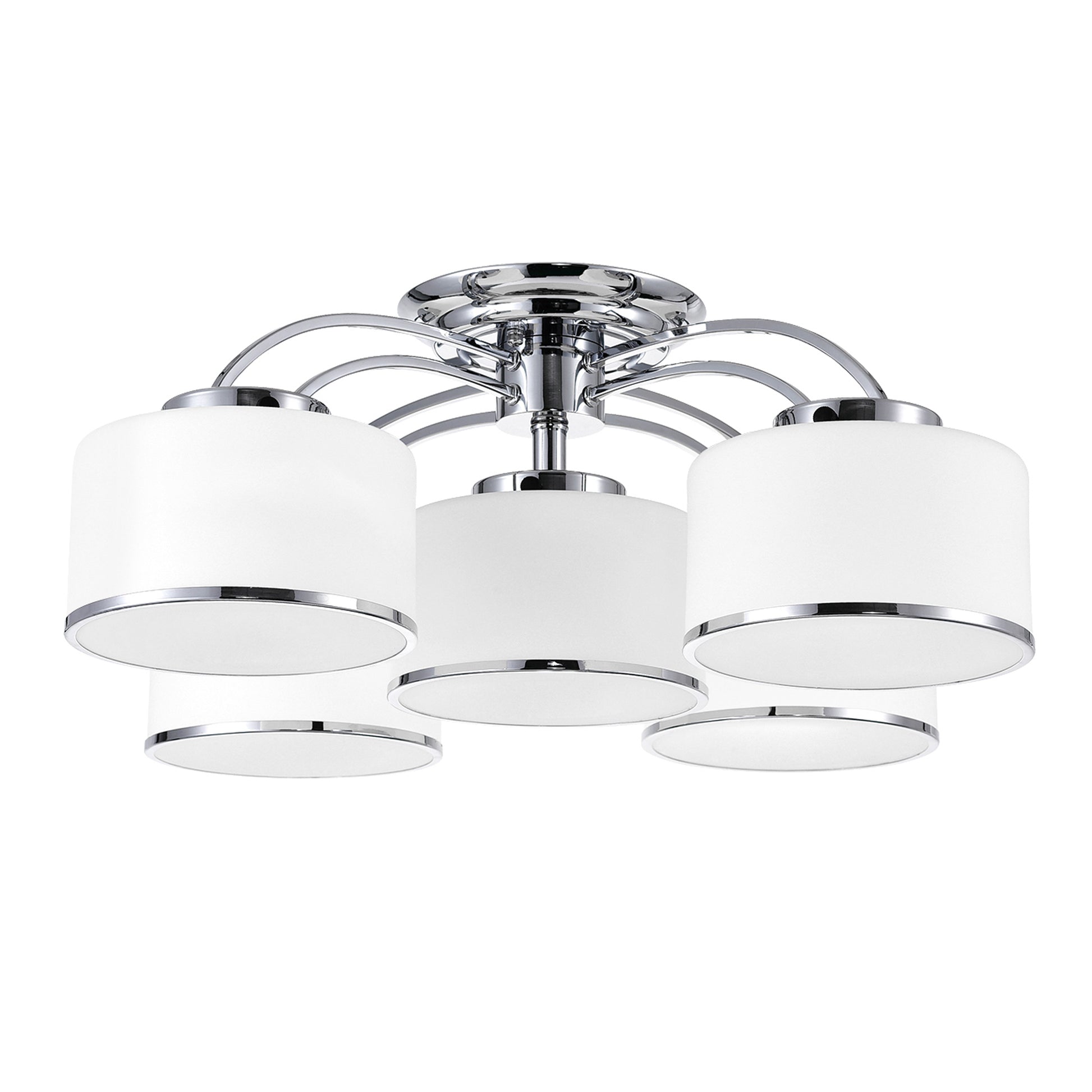Give your bedroom a brilliant glow and heaps of visual interest through this ceiling light. The Frosted 5 Light Flush Mount is designed with a chrome-finished metal base with five arms holding off-white glass shades. For continuity and contrast, the bottom edge of the shades come with a chrome-finished rim. This neutral-toned light source can give an all-white room an upscale edge.