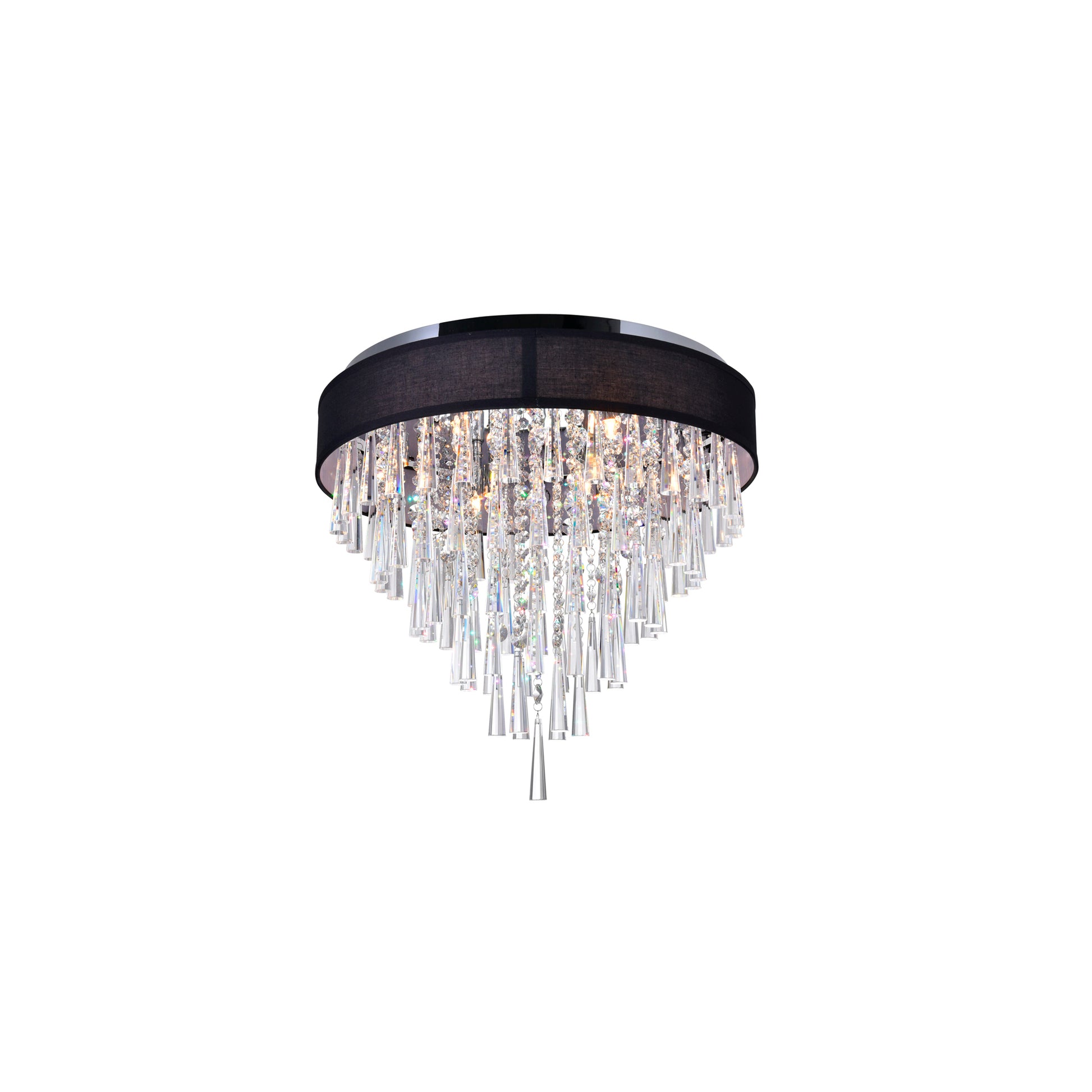 A light fixture and a décor statement in one. The Franca 8 Light Flush Mount displays its brilliance when turned on, and even when turned off. Hanging from a 22 inch circular shade, in black or off white, are tiered pieces of conical glass tubes and clear crystal strands. Light is emitted by eight bulbs and reflected beautifully by the crystal drops.
