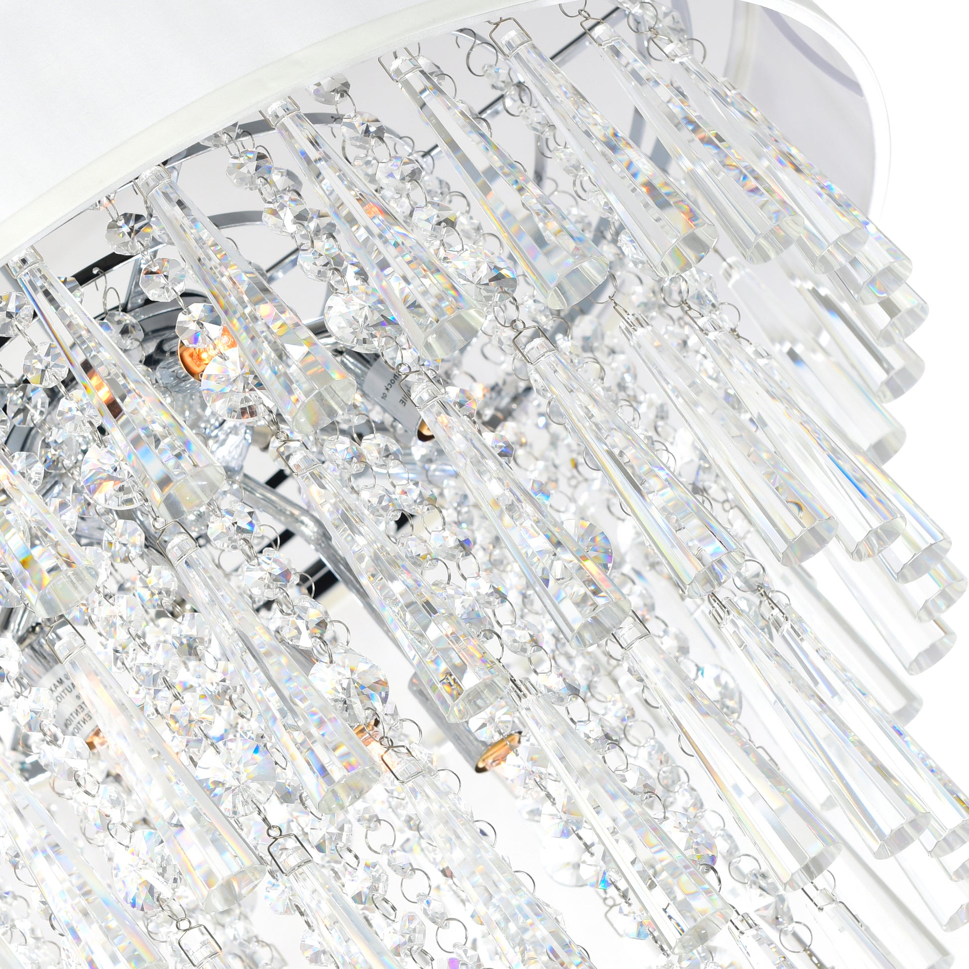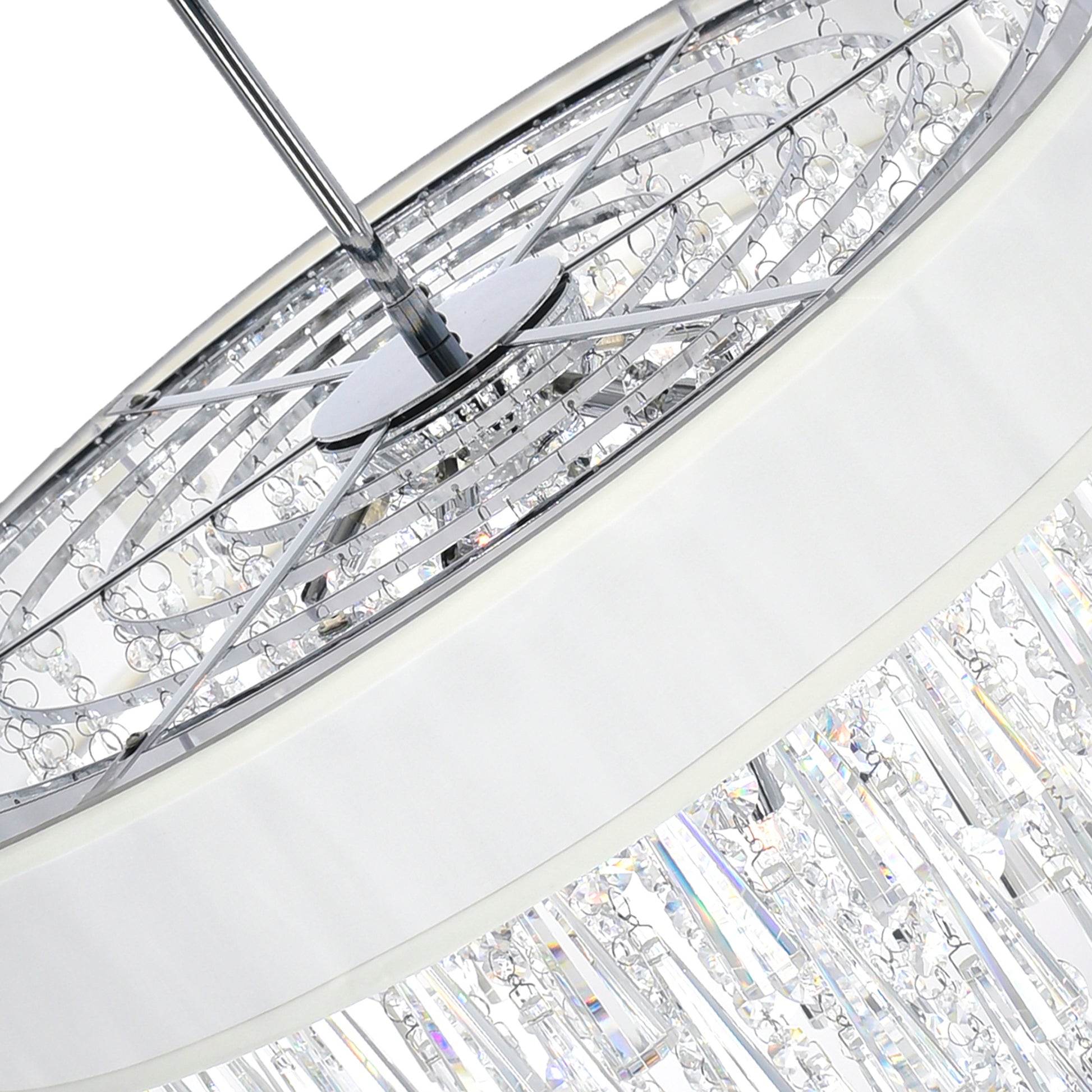 Bling it on! The Franca 8 Light Chandelier features clear glass drops that offer undeniable brilliance. Crystal droplets are held in place by a 22 inch drum shade, in off white or black, connected to an adjustable chrome rod with chrome canopy. This large drum shade chandelier is a glamorous choice for modern homes in need of a sparkling update.