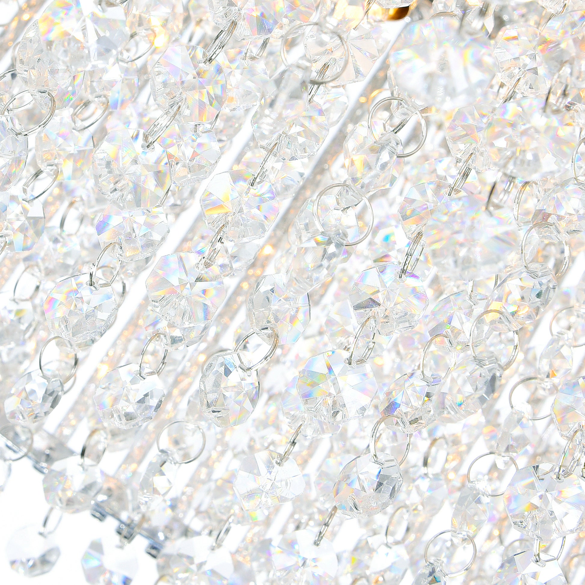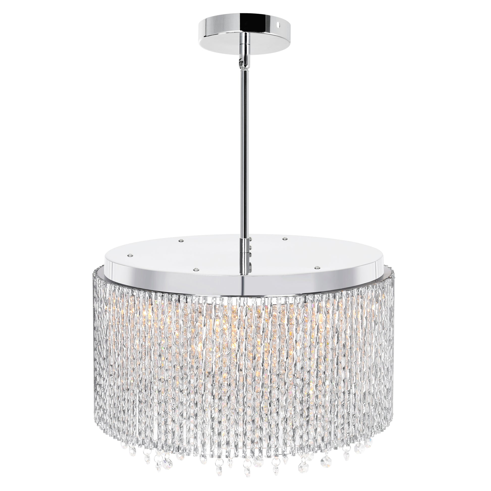 There's always room for a little sparkle. Go ahead and replace your current light fixture with the Claire 14 Light Chandelier. Designed to elevate the ambiance of any space, this lighting option delivers a radiant glow with chrome finish and crystal strand embellishment. The round drum shade exudes a sense of flowing movement perfect for bringing balance to angular tables or predictable spaces.