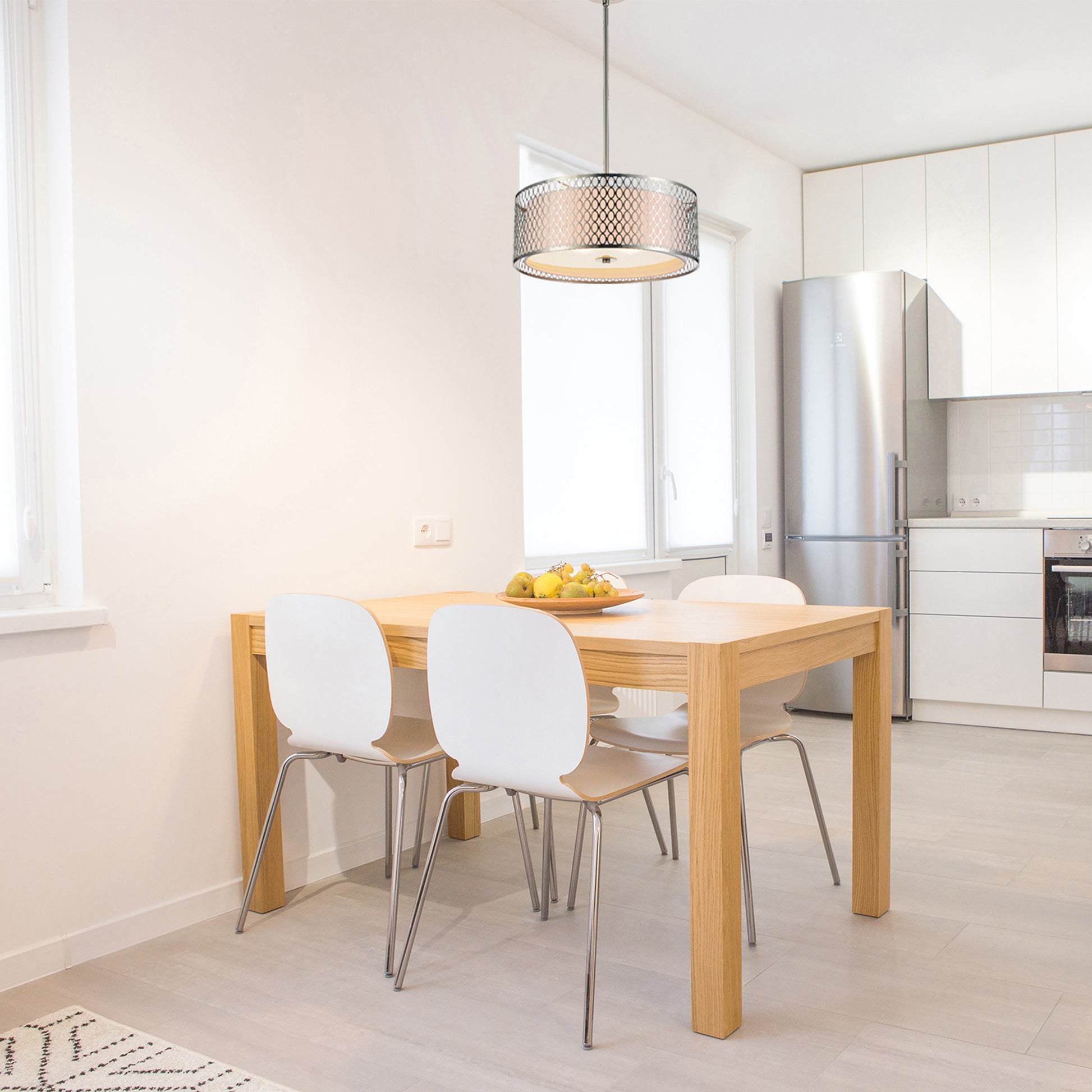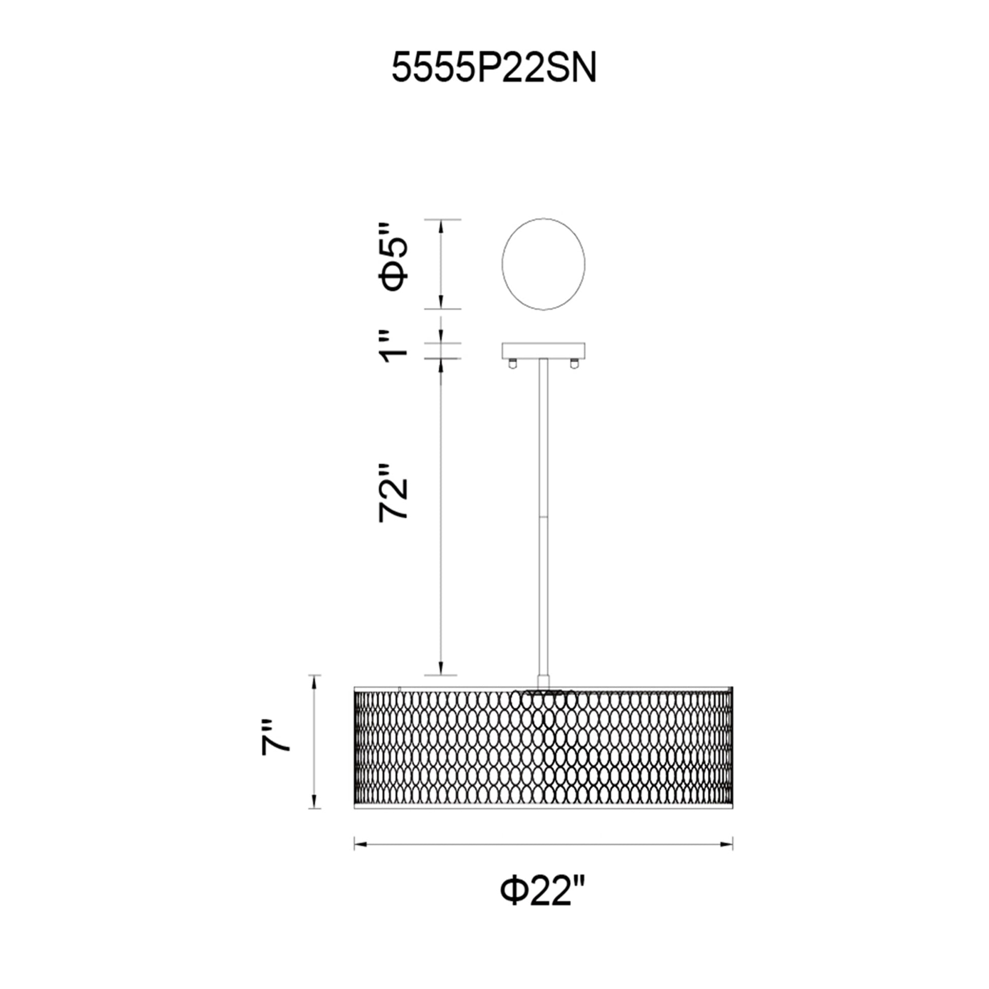 Elevate your space with this elegant and easy-to-install drum shade chandelier. The Mikayla 5 Light Chandelier features a 22 inch outer drum shade in patterned metal finished in satin nickel. The inner drum that diffuses light is in off-white. Ideal above a dining table, a kitchen counter, or even a pool table, this light fixture will illuminate any space with a beautiful glow.