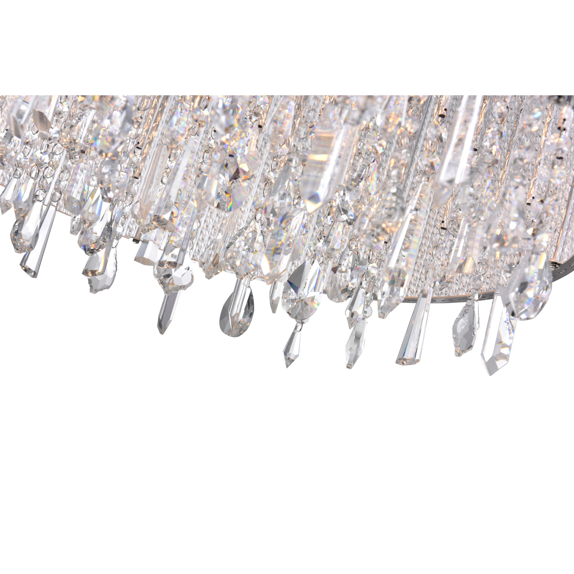 Spoil your home today with the Benson 14 Light Flush Mount. On a chrome ceiling plate is a shade made-up of extra slender clear crystal tubes. Underneath are fourteen bulbs and dangling faceted crystals of varying shapes. Mounted close to the wall, this compact light source optimizes headspace while delivering necessary light. Replace that bland and boring light fixture today with this simple yet opulent crystal drum shade.
