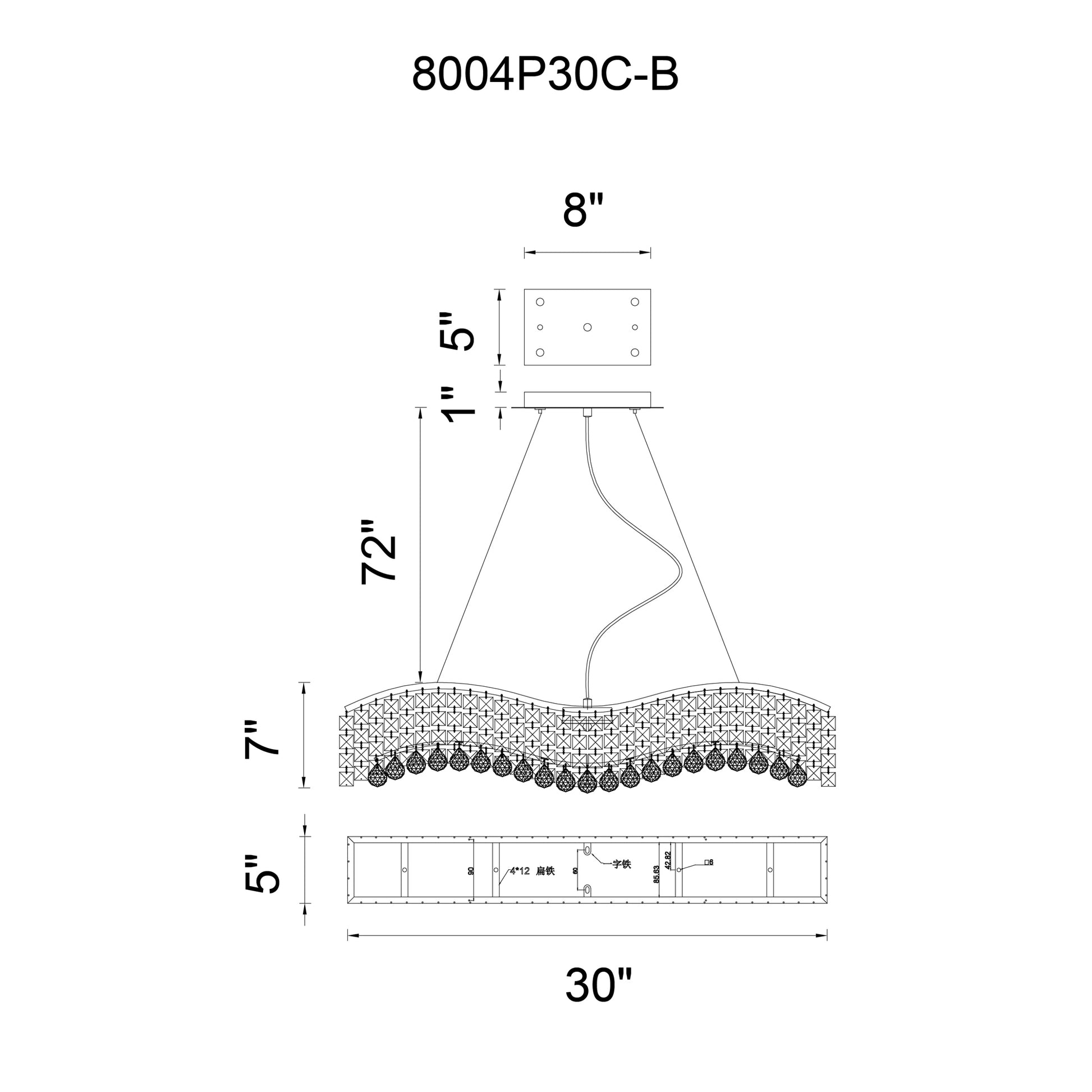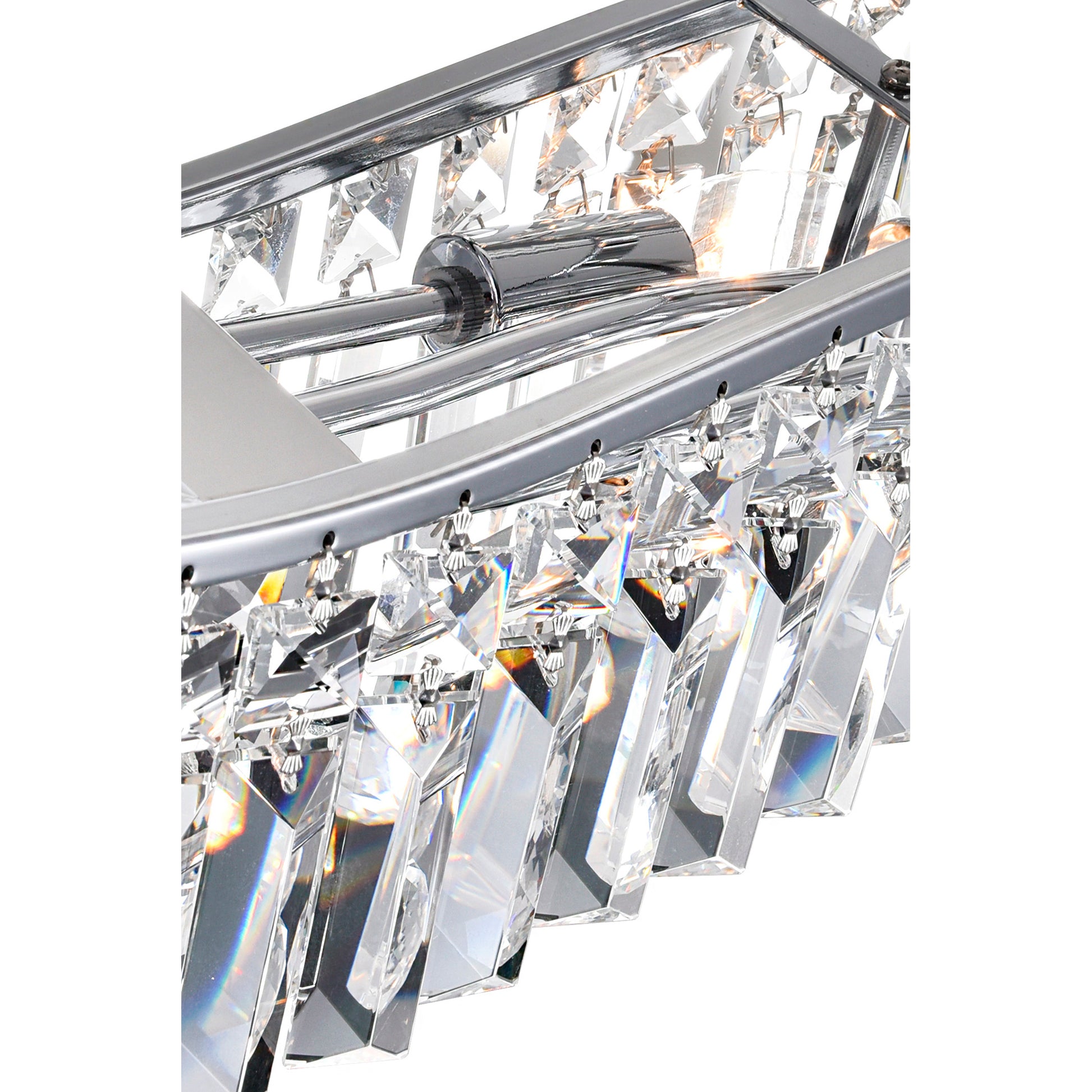 An attractive linear light fixture for adding movement and rhythm to a space. The Glamorous 5 Light Chandelier measures 30 inches long and has a wavy profile. Faceted crystal bars dangle from its chrome-finished metal frame. Completing the crystal shade are dangling crystal balls hanging underneath the candelabra base.