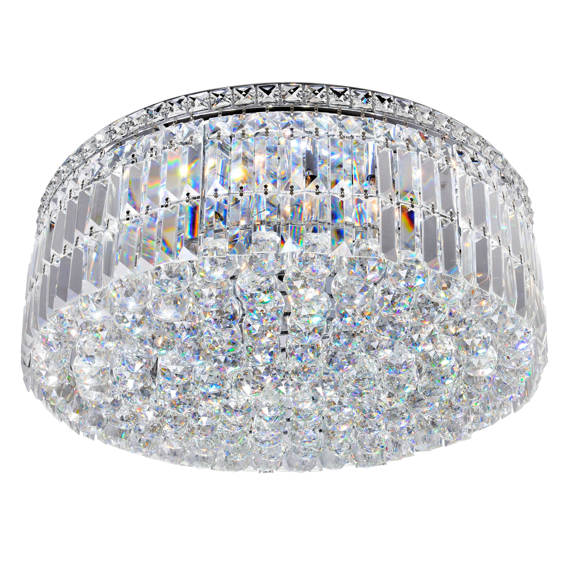 A crystal-encrusted light fixture perfect for adding a bit of razzle dazzle to your home. The Colosseum 10 Light Flush Mount is a 24 inch round crystal light source that sits close to the ceiling. It has 10 candelabra bulbs ready to deliver a sophisticated glow to your space. This glamorous fixture will fit perfectly in low-ceiling areas be it a bedroom, living room, hallway, or entryway.
