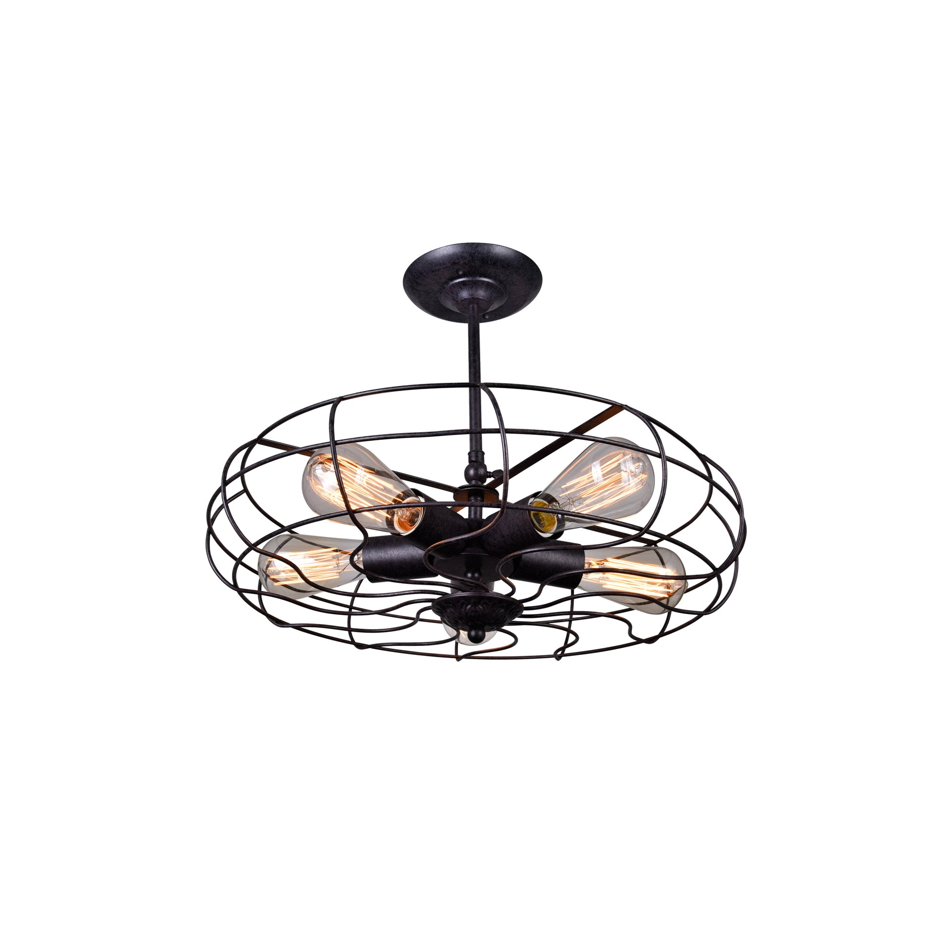 Add a playful twist to your lighting with the Pamela 5-Light Chandelier. Inspired by vintage cooling fans, this fixture features an open metal cage frame with bulbs arranged like fan blades, creating a dynamic and eye-catching design. Offered in a rust finish this chandelier brings character and charm to any room, perfect for industrial, farmhouse, or eclectic interiors.