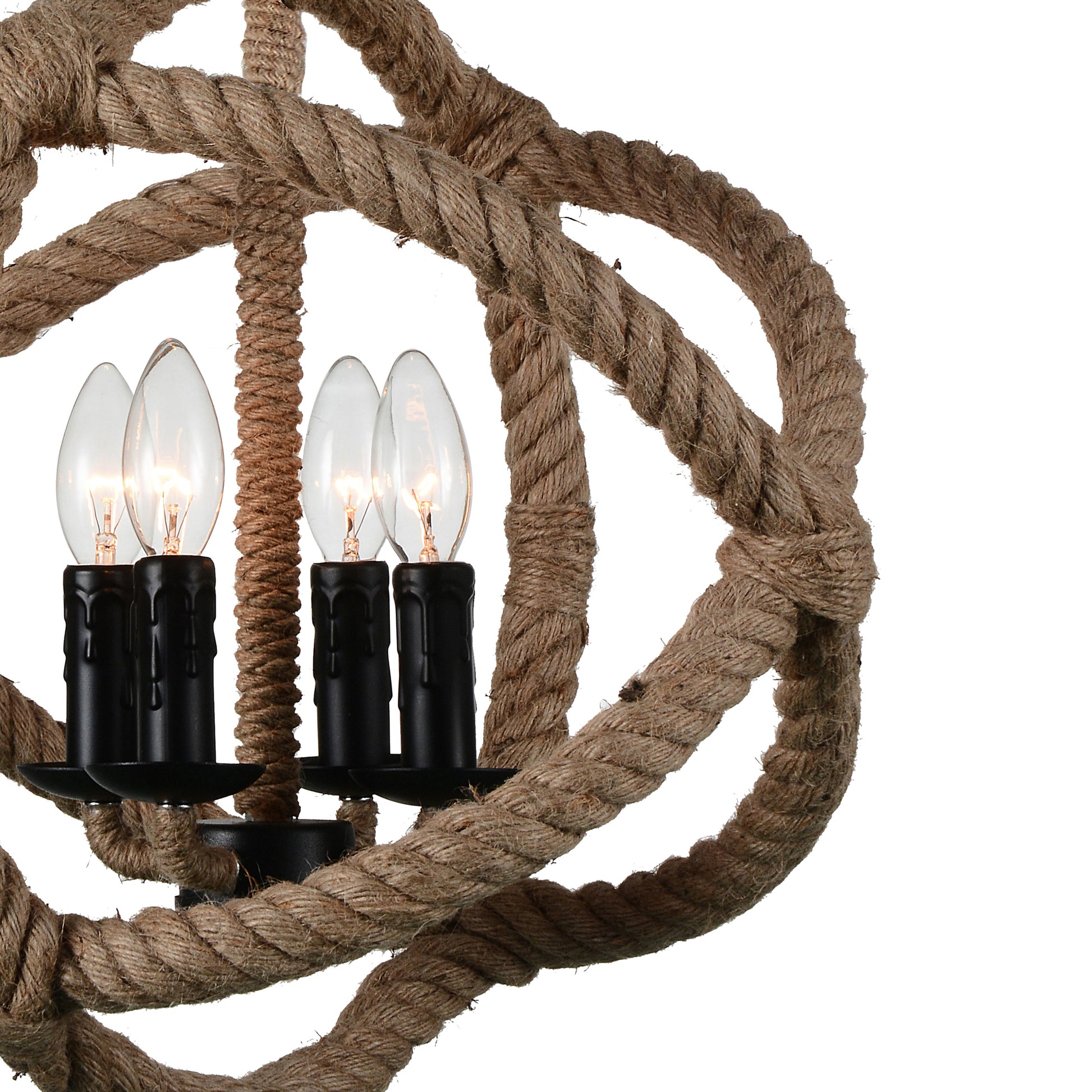 Create a more welcoming dining environment by replacing your light fixture with a pair of the Padma 4 Light Chandelier. This rustic light fixture is designed with a geometric pendant with hemp rope frame. A black candelabra base sits at the center holding four candelabra bulbs. This 15 inch pendant light displays a rugged, natural beauty perfect for bringing any space that cozy, earthy, and organic feel. '