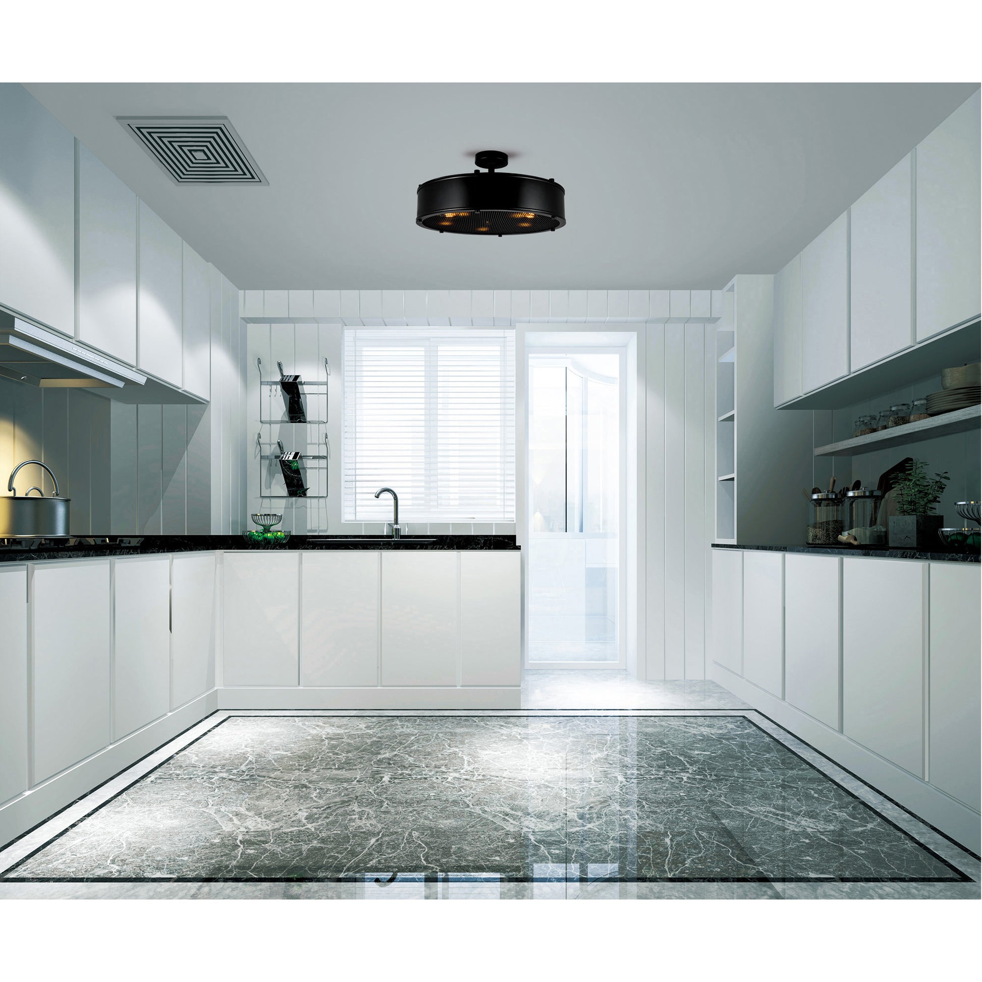 Designed with a bold and strong character, the Tigris 5 Light Flush Mount won't back down in bringing style to your space. It is designed with a metal drum shade in black with mesh bottom to provide a glimpse of the five E26 bulbs. The semi-flush mount style allows an uplit effect while also casting illumination downwards. This light source is perfect for opening up small spaces and giving them a brighter and bigger look.
